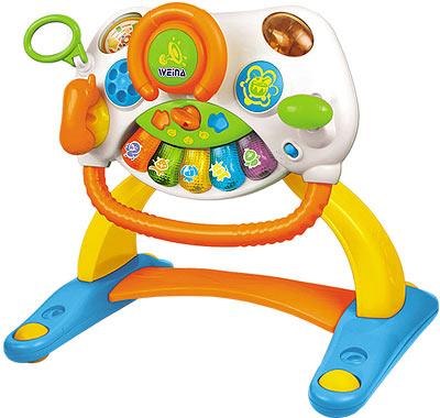 Столешница, которая бывает как круглая, так и прямоугольная, фиксируется на уровне середины груди ребенка. Туда можно положить какие-нибудь игрушки, чтобы сделать передвижения ребенка веселее и интереснее.