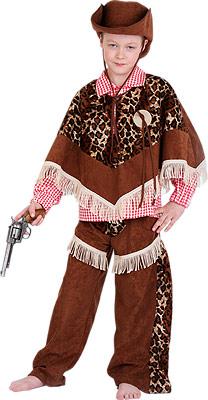 Современный ковбойский наряд – это расклешенные брюки, рубашка, жилетка и лихая шляпка с полями. Отделка из бахромы, яркий шейный платок и традиционный ковбойский кольт помогут завершить образ благородного героя из мира непокоренных прерий. Детский карнавальный костюм ковбоя позволит вашему ребенку чувствовать себя решительным, смелым и ловким, подчеркнет его индивидуальность и оставит потрясающие впечатления.