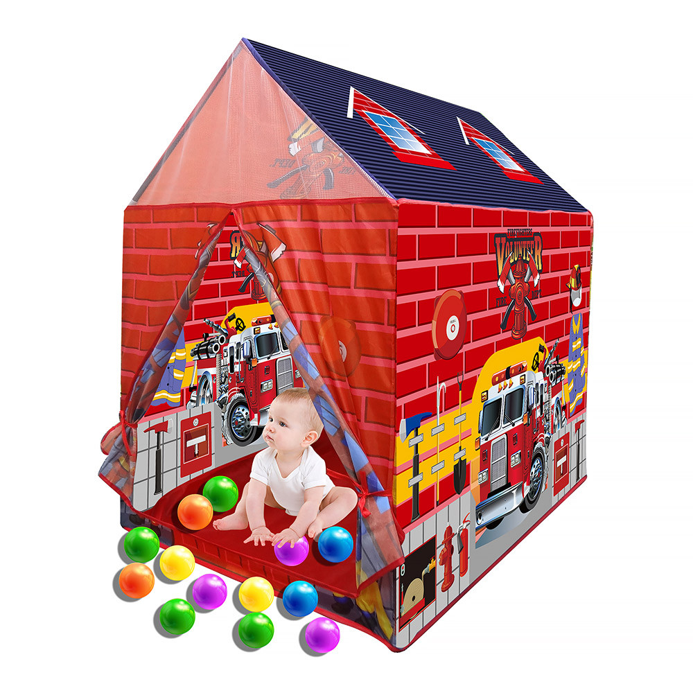 Детская палатка выполнена в форме красочного игрового домика Пожарная станция. Дизайн палатки очень необычный, с яркими изображениями атрибутов пожарных. Она поможет при сюжетно-ролевых играх и надолго увлечет ребенка. Уютная и вместительная палатка замечательно подойдёт как для игр в помещении, так и для летнего отдыха детей за городом, на даче или пикнике. Это отличное место как для самостоятельной, так и групповой игры малышей. В домике запросто можно разместиться двум детям.