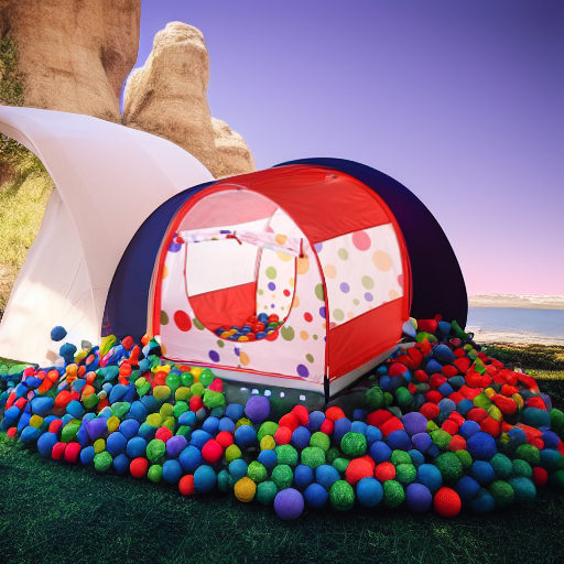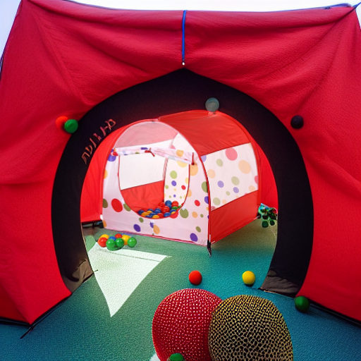 - палатка в форме арки, с разноцветными кружочками на белом фоне и красными вставками и белой сеточкой