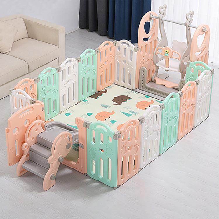 - В комплекте забор-ограждение с дверкой и игровой панелью (всего 12 модулей), качели с музыкальной кнопкой, горка с защитными бортиками от случайного бокового падения, напольное покрытие для комфортного игрового процесса (коврик-пазл)