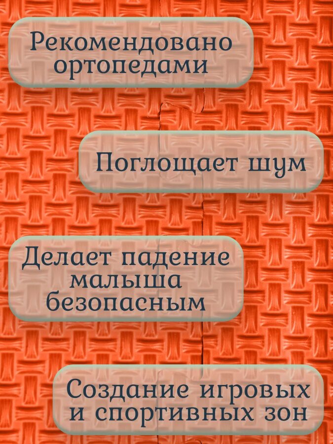 Это не просто универсальное напольное покрытие для детской комнаты, но и отличный практический материал для покрытия на пол, в кухне или ванной. Мягкий пол приятен на ощупь, вместе с тем он гипоаллергенный и безопасный для здоровья. Фактурное тиснение ковра предотвратит скольжение, а долговечный ЭВА материал обеспечит тепло и звукоизоляцию. Мягкая поверхность смягчит падение ребенка. Идеален коврик для ползания малыша
