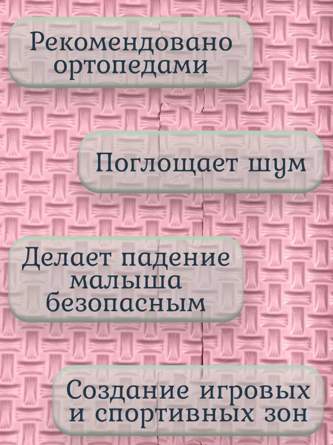 Это не просто универсальное напольное покрытие для детской комнаты, но и отличный практический материал для покрытия на пол, в кухне или ванной. Мягкий пол приятен на ощупь, вместе с тем он гипоаллергенный и безопасный для здоровья. Фактурное тиснение ковра предотвратит скольжение, а долговечный ЭВА материал обеспечит тепло и звукоизоляцию. Мягкая поверхность смягчит падение ребенка. Идеален коврик для ползания малыша