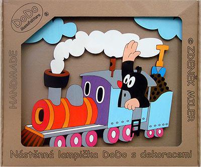 Настенная лампа с деревянной панелью КРОТ НА ПАРОВОЗИКЕ украсит детскую комнату.
