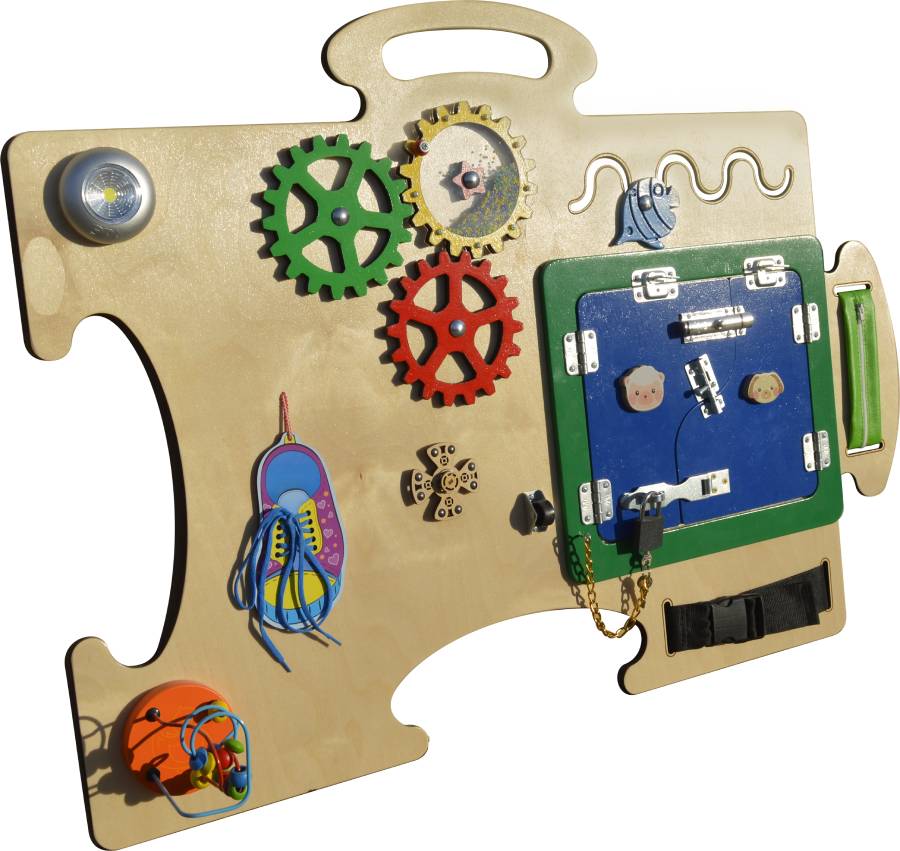 Данный Бизиборд сделан в виде детали пазла. Предназначен для индивидуальных и коллективных занятий в детских центрах и дошкольных учреждениях. В производстве использованы экологически чистые сорта фанеры, водная акриловая краска, гипоаллергенный лак. Размер изделия: Высота: 671 мм; Ширина: 923 мм; Толщина: 30 мм. Тех характеристики: Оборудование допустимо к использованию в помещениях при температуре: от +1 до +30 и допустимой влажности 40-60 % Состав: Фанера, металл, текстиль Страна изготовления: Россия Торговая марка (бренд): Romsens Назначение: Развитие мелкой моторики рук, координации движений, усидчивости, логики, воображения, памяти. Изделие имеет сертификат соответствия Техническому регламенту Таможенного союза ТР ТС 008/2011. Изделие соответствует нормам пожарной безопасности (сертификат соответствия ПОЖАРНОЙ БЕЗОПАСНОСТИ). Примечание: предприятие-изготовитель оставляет за собой право, без уведомления потребителя, вносить незначительные изменения в конструкцию, комплектацию, технические характеристики, внешний вид, включая изменения по упаковке, не ухудшающие потребительских свойств изделия и его методического назначения.