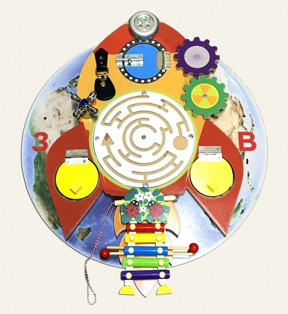 Бизиборд Ракета включает в себя: тактильный лабиринт, металлофон, шестеренки, дверцы открывающиеся с тематическими рисунками, молнии, застежки, замочки, фонарик. Ребенок обогащают свой познавательный опыт и кругозор, приобретая представления об устройстве ракет.