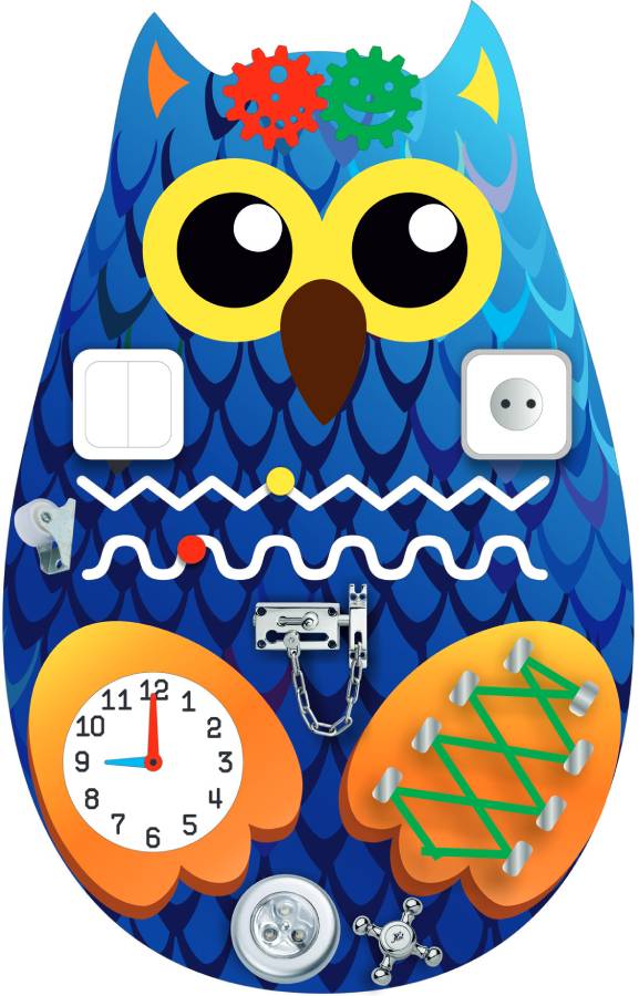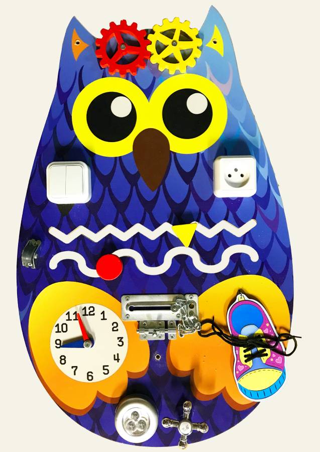 Бизиборд Сова поможет занять детей полезными и увлекательными играми. Малыши обожают изучать штучки и предметы, которыми каждый день пользуются взрослые. На развивающей панели ребенку можно всё-всё: трогать и тянуть, крутить и вертеть, защелкивать и цеплять, шнуровать и распускать зашнурованное.