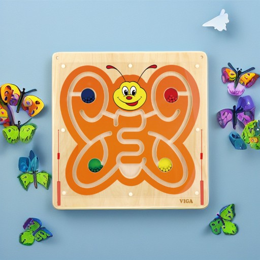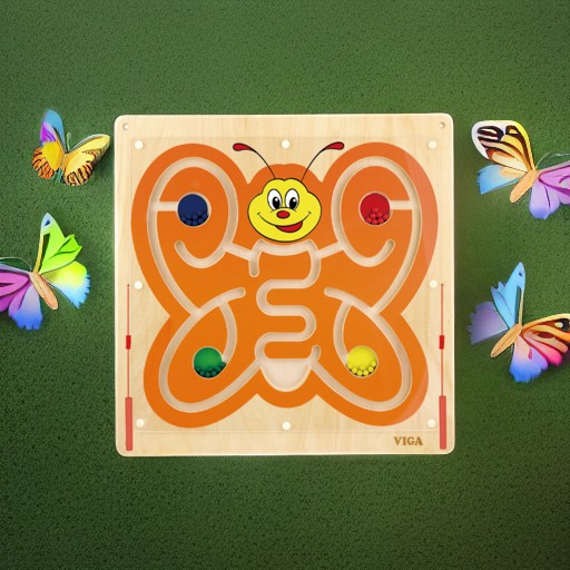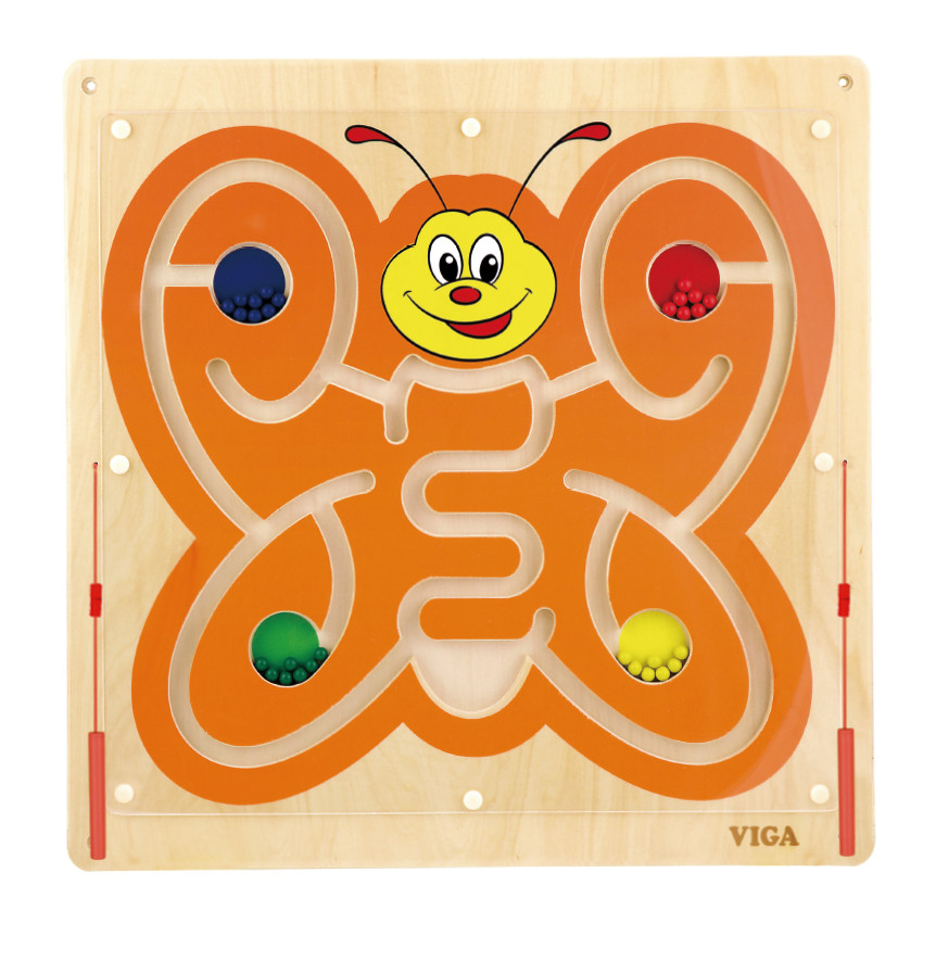 Настенная панель выполнена в виде Бабочки и представляет собой магнитный лабиринт с подвижными элементами в виде шариков 4 разных цветов (синий, красный, зеленый, желтый). Перемещение металлических шариков по лабиринту поля с помощью магнитной ручки способствует улучшению координации глаз-рука, развивает графомоторные навыки и учит различать направления. Возможность работать с двумя ручками тренирует владение обеими руками (справа и слева). Кроме полезных манипулятивных свойств, Бабочка будет отличным украшением группы в детском учреждении.