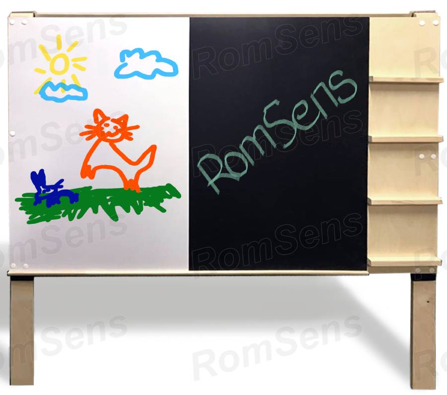 Двусторонний развивающий стенд отвечает всем требованиям ФГОС: он полифункциональный, трансформируемый, доступный и безопасный. С одной стороны стенда находятся 2 доски: одна классическая для работы с мелом, а вторая – магнитно-маркерная, подходящая как для письма, так и для работы с наглядными пособиями на магнитах. С другой стороны стенда находится настоящий тактильно-дидактический комплекс. Его поверхность разделена на условные зоны, отвечающие за развитие определенного навыка.