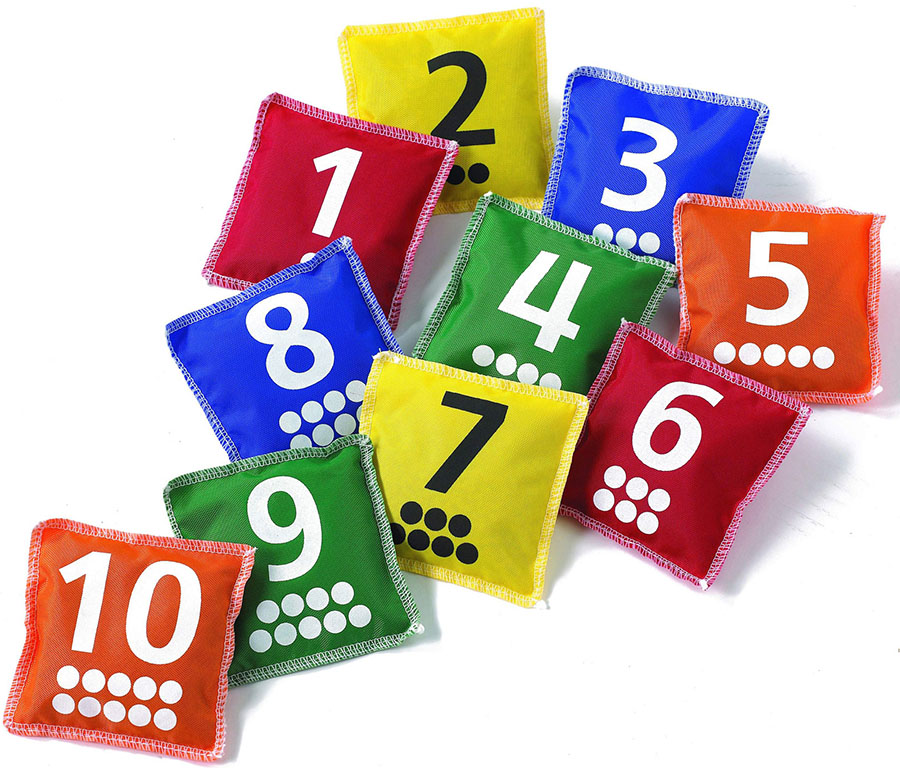 Набор разноцветных мешочков с числами от 1 до 10 помогут в игровой форме дать и закрепить знания о цифрах (на каждом мешочке есть цифра и равное этой цифре количество точек, чтобы их можно было посчитать).