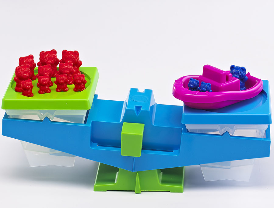 - В комплекте весы с нулевой отметкой и отсеками для хранения грузов, 2 чаши объемом 500 мл, 2 крышки-подставки для взвешивания маленьких грузов, комплект из 24 фигурок мишек с рюкзаками