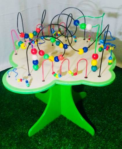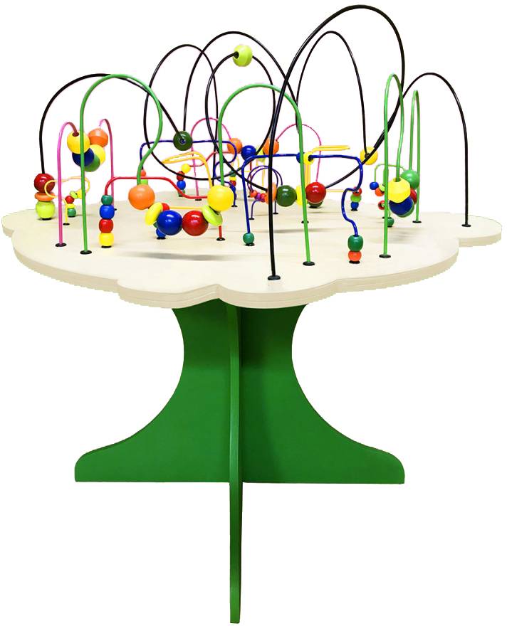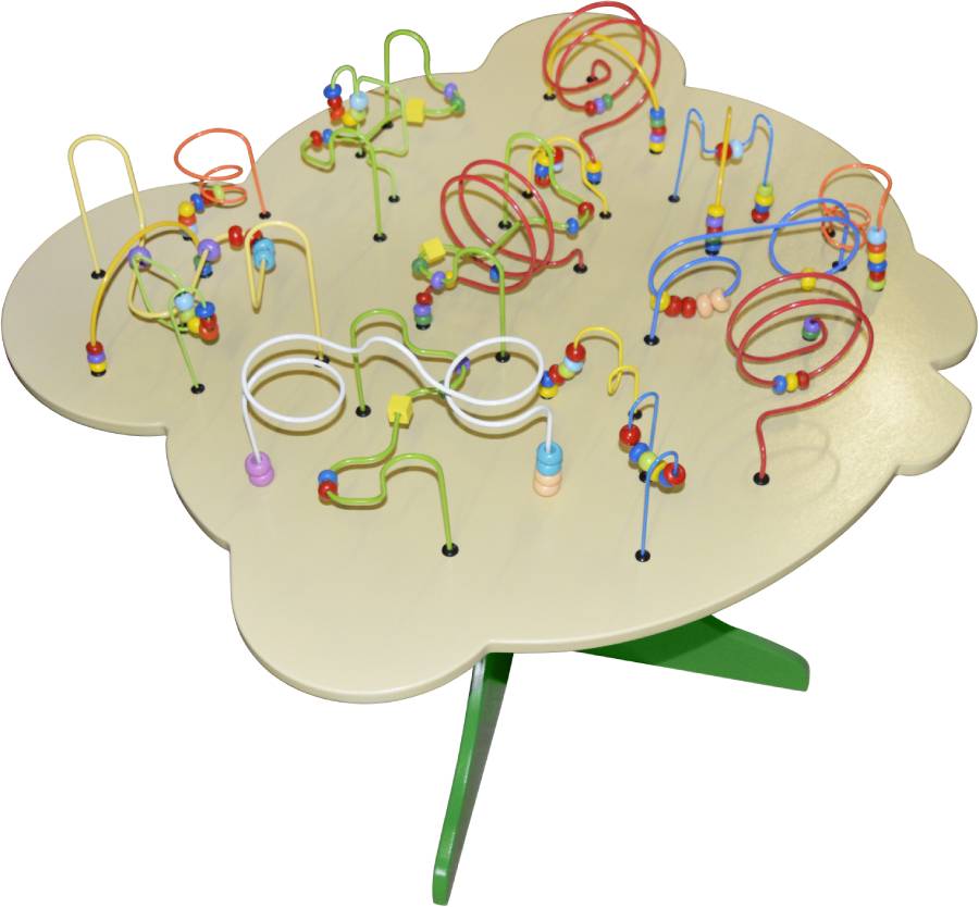 Дидактический стол необычной формы – без острых углов – будет хорошим дополнением интерьера любой игровой комнаты или уголка. Он надолго увлечет малышей, ведь на нем такое большое количество деревянных бусин и изогнутых лабиринтов. Разноцветные бусины – одну или сразу несколько штук – можно двигать по спирали и другим направляющим. Это прекрасный тренажер для маленьких пальчиков.