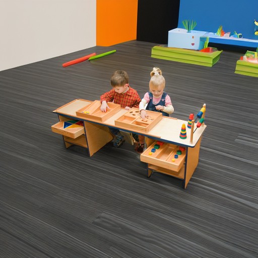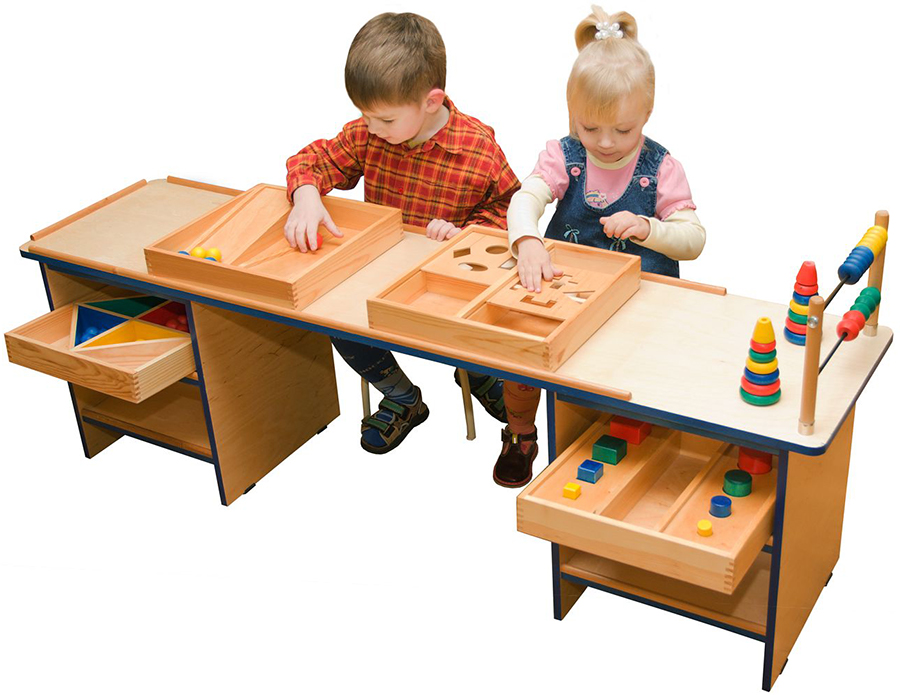 Дидактический стол размерами 150х120х60 см, оборудованный развивающими играми, а также вместительными нишами для размещения других игрушек. Конструкция этого стола сочетает удобство и безопасность и позволяет проводить с детьми как групповые, так и индивидуальные занятия. Наборы дидактических игрушек, входящие в комплект столов, состоят из специально созданных для развития малышей предметов. Каждый предмет развивает определенный навык или улучшает определенную способность. Стол состоит из 5 зон: 1-я — щит с использованием двух видов геометрических форм, 2 разноцветные пирамиды и счеты с шарами и кольцами; 2-я — разноцветные ниши, в каждой из которых находится по 10 шаров такого же цвета; 3-я — ящик с двуми горками-скатами; 4-я — ящик с двумя секторами, в которых находятся отверстия для различных по форме элементов; 5-я — ящик с объемными цилиндрами и брусками, разными по цвету и величине. Занятия за дидактическим столом развивают мелкую моторику малыша, вырабатывают координацию движений, умение различать цвета и формы предметов, сравнивать их и строить серийный ряд. Помимо развития способностей ребенка игры за таким столом выполняют еще и воспитательную функцию: ваш малыш учится ухаживать за собой, убирать свое рабочее место, раскладывать игрушки по полочкам и коробкам.