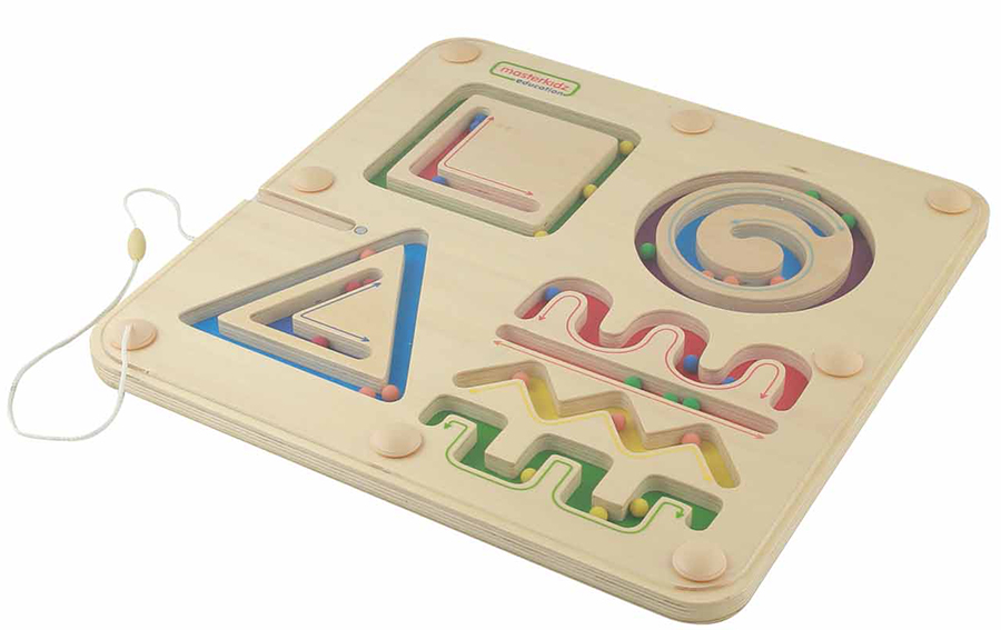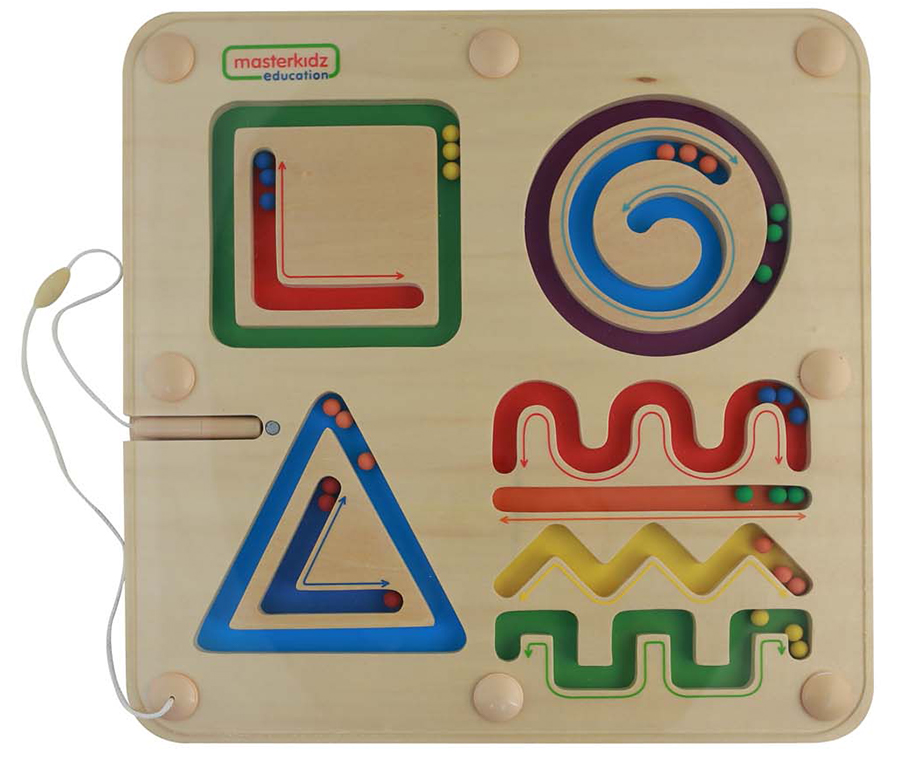Панель предназначена для развития мелкой моторики, знакомит с формами, линиями и цветами, подготавливает руку к письму. На панели представлены 7 лабиринтов, магнитный стержень на веревочке и набор магнитных шариков. Простая и прочная магнитная доска для кальки, способствующая развитию мелкой моторики и изучению линий и форм