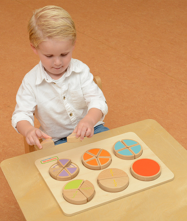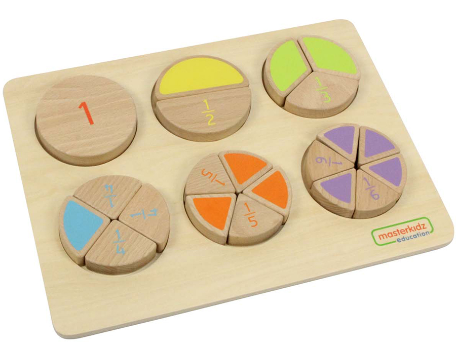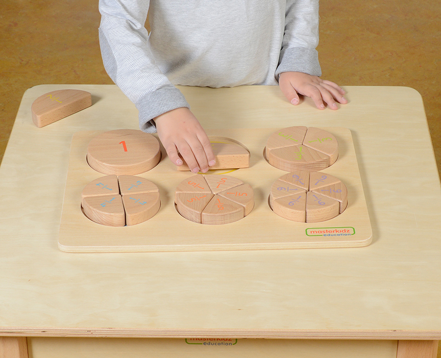 Панель предназначена для изучения понятий «часть», «целое», «дробь». На ней представлены 6 кругов, составленных из пропорциональных секторов, маркированных по долям и демонстрирующие целые и половинные значения, третьи, четвертые, пятые и шестые части. Круги разного цвета и одинаковые по размеру. Цвет доли каждого круга совпадает с цветом цифровой маркировки данной доли на обратной стороне. Благодаря этому визуальному представлению дроби становятся проще. Каждую головоломку можно подобрать по цвету или дроби, указанной на обратной стороне. Набор из 6 головоломок с дробями помещается на распечатанную доску-пазл. Наде из европейского дерева