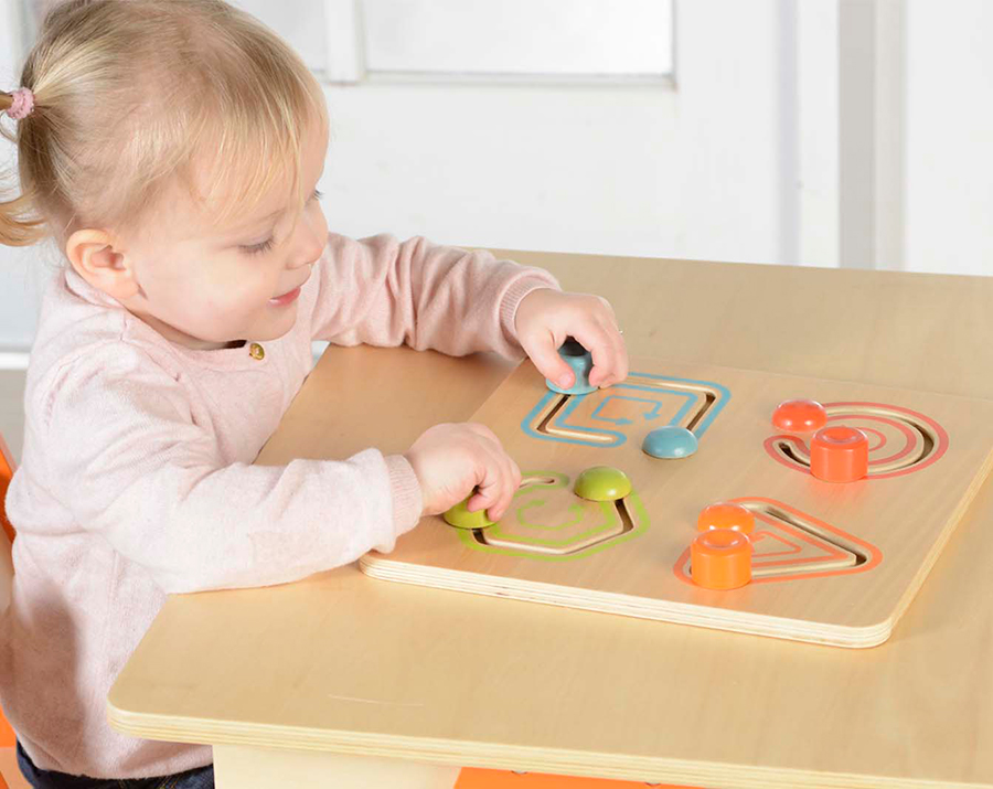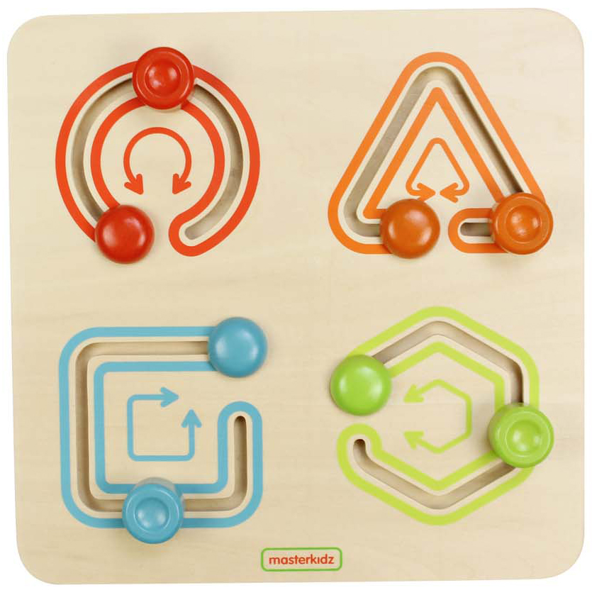 На лицевой стороне панели расположены 4 лабиринта различной геометрической формы: треугольник, квадрат, круг и шестиугольник. Панель выполнена из березовой фанеры. Знакомит детей с видами геометрических фигур. Это простая игрушка для тренировки мелкой моторики, состоящая из 4 различных геометрических фигур. Маленькие ручки будут держать деревянные бруски и перемещать их по рельсам, следуя направлениям стрелок. Простая, но важная игрушка для малышей на ранних стадиях развития
