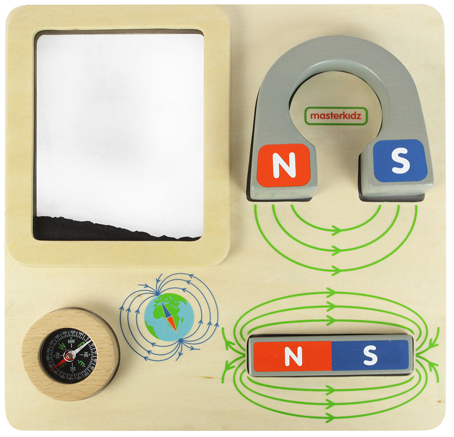 Панель выполнена из березовой фанеры, на лицевой стороне которой расположены: подковообразный магнит, стержневой магнит, отсек с железным порошком, компас. Доска Magnetism Discovery — это первый ресурс STEM, состоящий из 4 отдельных компонентов, которые блестяще знакомят молодых ученых и инженеров с магнетизмом! Есть съемная планка и гигантский магнит-подкова, позволяющие детям проверять предметы, чтобы выяснить, магнитные они или нет. А когда их помещают вместе, они могут испытывать притяжение и отталкивание. Компас можно использовать, чтобы найти северный магнитный полюс Земли и лучше понять, что Земля сама по себе является гигантским магнитом. А железное окно для опилок позволяет детям аккуратно собирать и бросать опилки в конструкции, которые они сами сделали. Магниты обладают волшебными свойствами, и детям понравится возможность хранить, использовать и раскрывать свои внутренние секреты