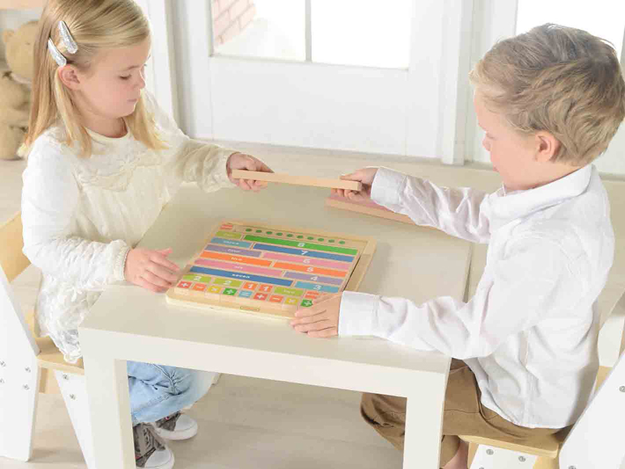 На лицевой части панели представлены счетные плитки в разных цветах, в левой части панели плитки прописаны на английском языке, в правой части пронумерованы от 1 до 10, в нижней части - 2 набора математических знаков. Блоки выполнены из устойчивого бука. Все числа, связанные с 10, доступны в этом наборе массивных деревянных кубиков. Все отдельные части имеют точный масштаб и существуют как кратные одному квадрату, поэтому блок из двух частей в два раза длиннее, блок из трех частей в три раза длиннее и т. д. В наборе также есть 2 набора символов числовых операций ( +, -, x, ÷ и =) плюс несколько дополнительных одно- и двухкомпонентных блоков. С помощью таких фигур можно выполнить широкий спектр простых математических вычислений, таких как сложение, вычитание и счет. Использование одного квадрата в качестве средства проверки вычислений усиливает процесс кинестетического обучения. Цифры появляются на лицевой стороне фигур, а на обратной стороне они показывают соответствующее количество точек, которые можно посчитать вслух, чтобы убедиться, что общая сумма верна