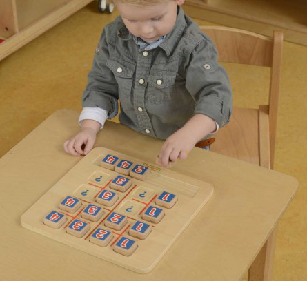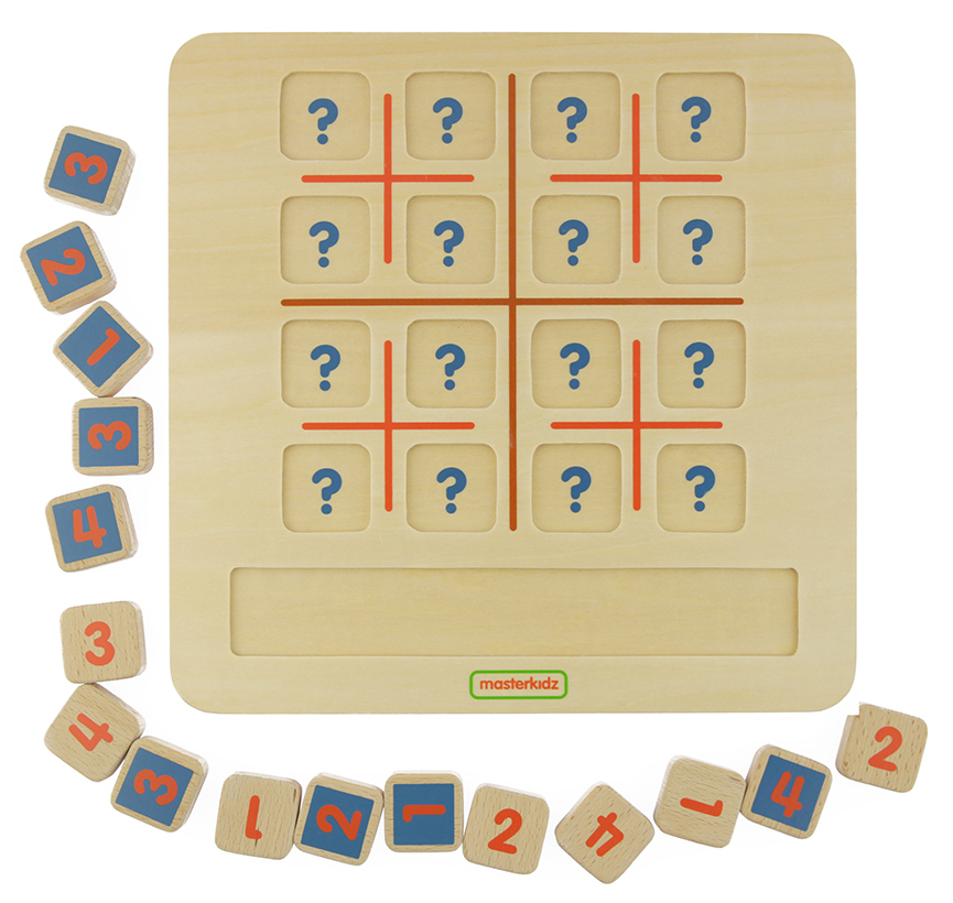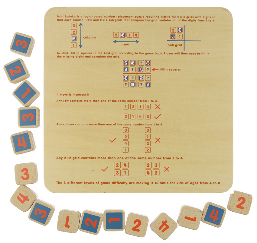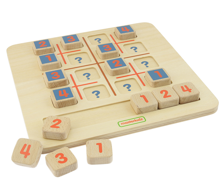 Основание панели из березовой фанеры, на лицевой части представлена японская игра-головоломка Судоку, основана на логическом расположении цифр. Игра на логику, которая не требует вычислений или же особых математических навыков. Блоки на панели выполнены из бука. Эта сетка 4 на 4 требует, чтобы дети размещали пронумерованные плитки в математической последовательности так, чтобы в каждой строке и каждом столбце были цифры 1,2,3 и 4. По сути, это упрощенная версия СОДУКО, требующая навыков счета и логического мышления
