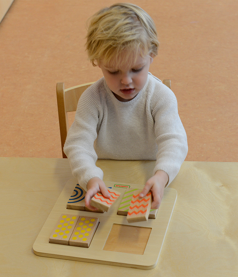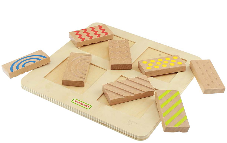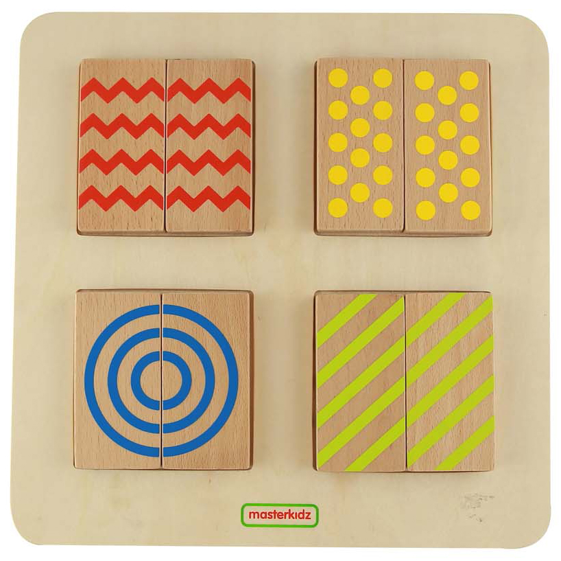 Панель содержит 4 различные текстуры - 2-сторонние половинки блоков. Одна сторона каждого блока имеет выгравированную текстуру, а другая сторона напечатана с тем же узором. Это позволяет использовать различные типы сенсорных игр на сопоставление. Доска, сочетающая цвет и текстуру на 8 двусторонних плитках из бука. На одной стороне нанесен печатный рисунок (зигзаг, изогнутость, точки и диагональные линии), на другой – тот же рисунок, но рельефно вырезанный на поверхности плитки. Дети могут смешивать и комбинировать плитки, сопоставляя их только на ощупь, на взгляд или сопоставляя с помощью осязания и зрения. Ношение повязки на глаза или использование удобной сумки добавит дополнительное измерение
