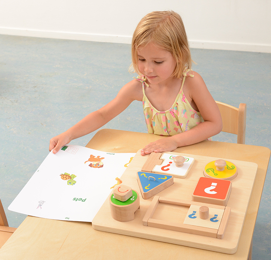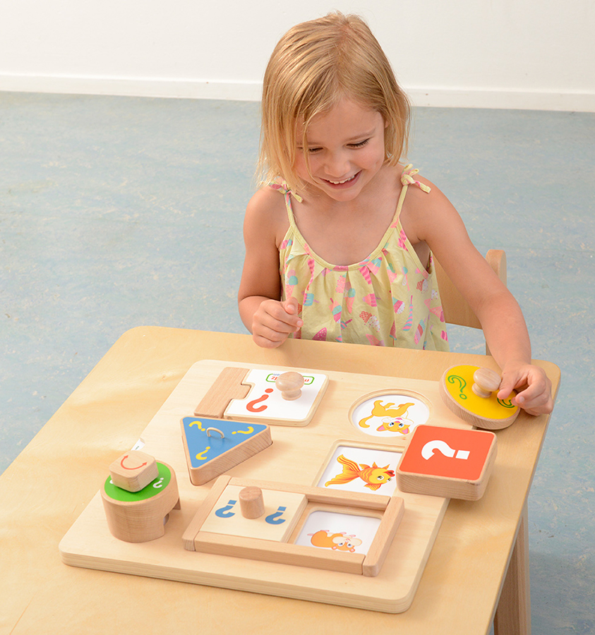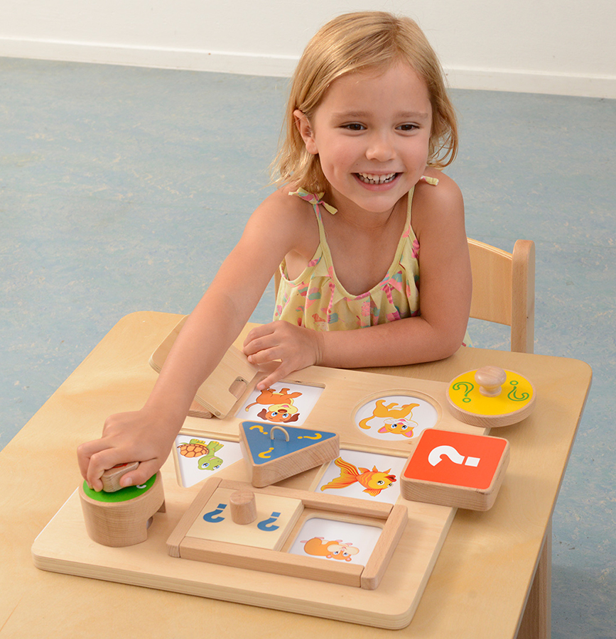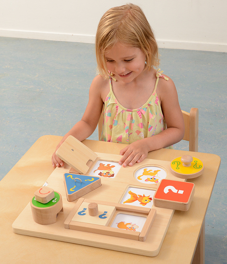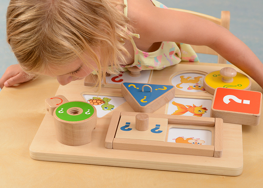 На лицевой части панели расположены шести элементов (окон) в разных геометрических формах, с различными механизмами открывания. Один из элементов содержит глазок с увеличивающей линзой. В процессе игры ребёнок угадывает, что там может быть: насекомое, транспорт, цвет, фигура и т.п., а далее может рассказать, что он знает об этом. Детское любопытство будет подогреваться этой замечательной обучающей доской, в которой есть шесть разных окон, каждое из которых защищено разными механизмами открывания. Учитель может положить карточки с изображениями в нужных местах на свои места, чтобы задать задание. Детям захочется открыть отверстия, чтобы узнать, что находится внизу. На карточках представлены разные темы, включая животных, транспорт, насекомых, цвета и формы, и все это дети узнают или смогут рассказать, чтобы узнать больше. После просмотра детям тоже захочется поиграть в игру на развитие памяти. Доска поможет детям лучше развить мелкую моторику и, используя свое природное любопытство, отправиться в путешествие, посвященное открытиям и обучению. Глазок с увеличительной линзой добавляет необходимой ловкости и удовольствия от просмотра скрытого изображения ниже