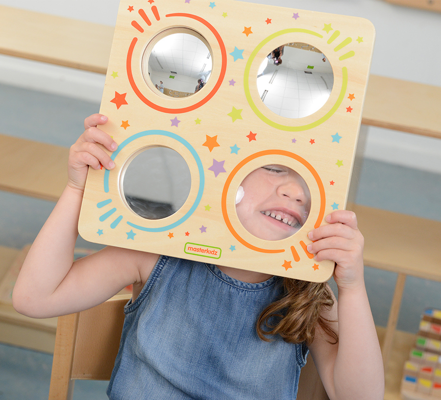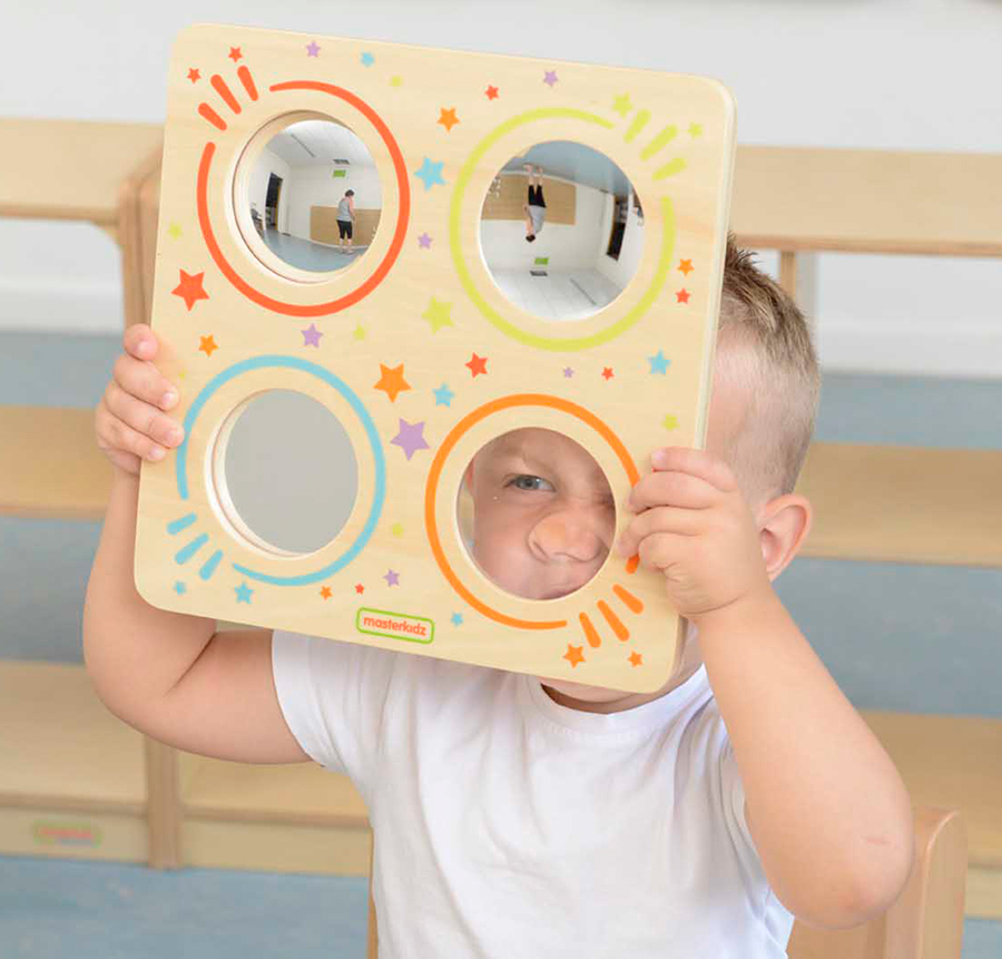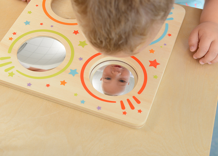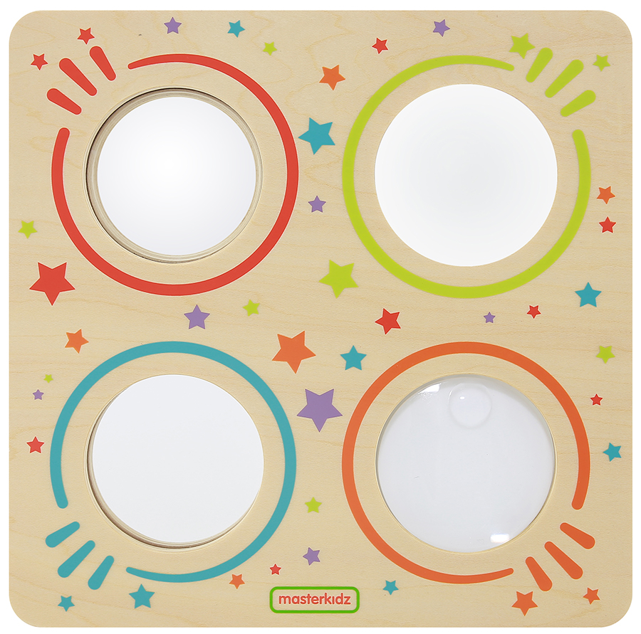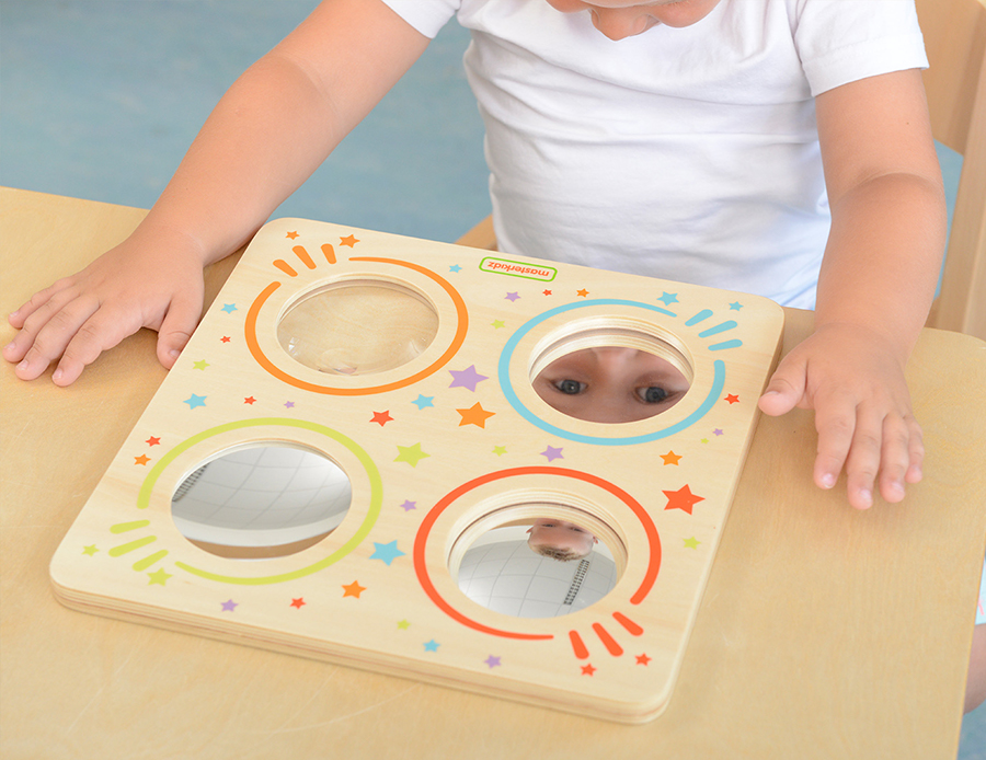 Пособие представляет из себя панель на которой закреплены: зеркало, лупа, вогнутая линза и выпуклая линза. Панель предназначена для развития кругозора, сенсорики; возможно использование при различных играх. Эта визуальная обучающая доска состоит из вогнутого, выпуклого, плоского зеркала и прозрачной лупы. Мир искажается этими вещами, способствующими разговорам о том, что мы видим, и веселью нашего изменившегося отражения.