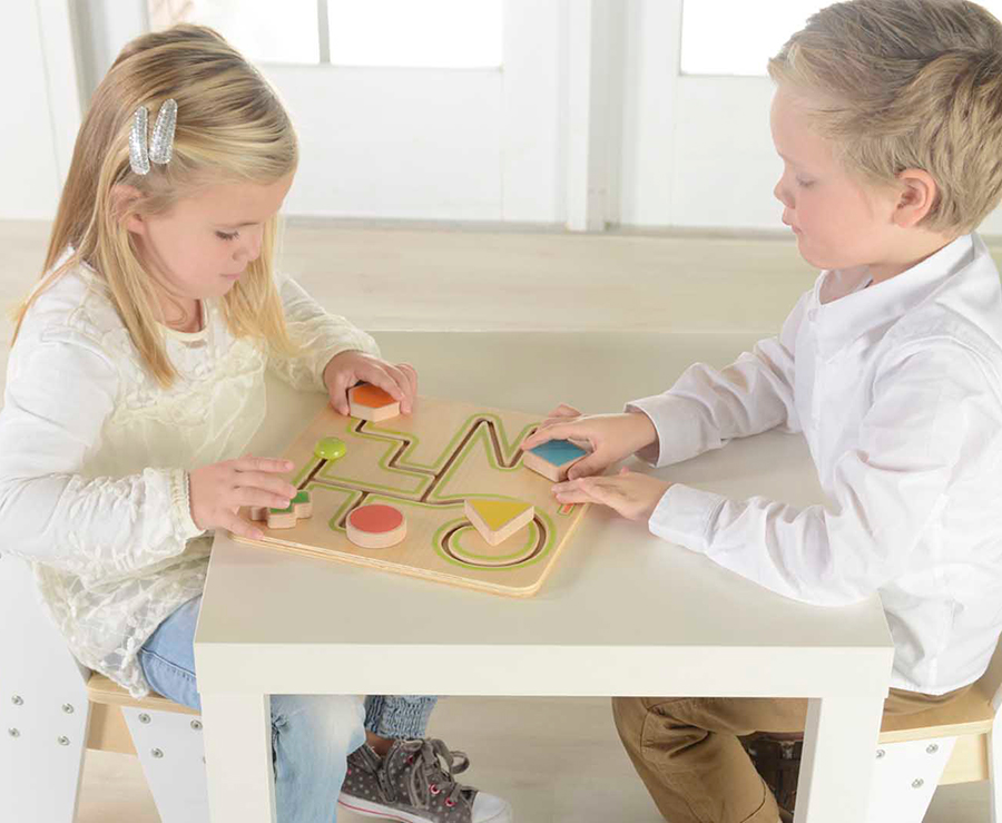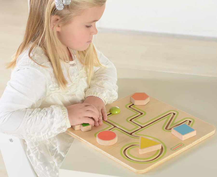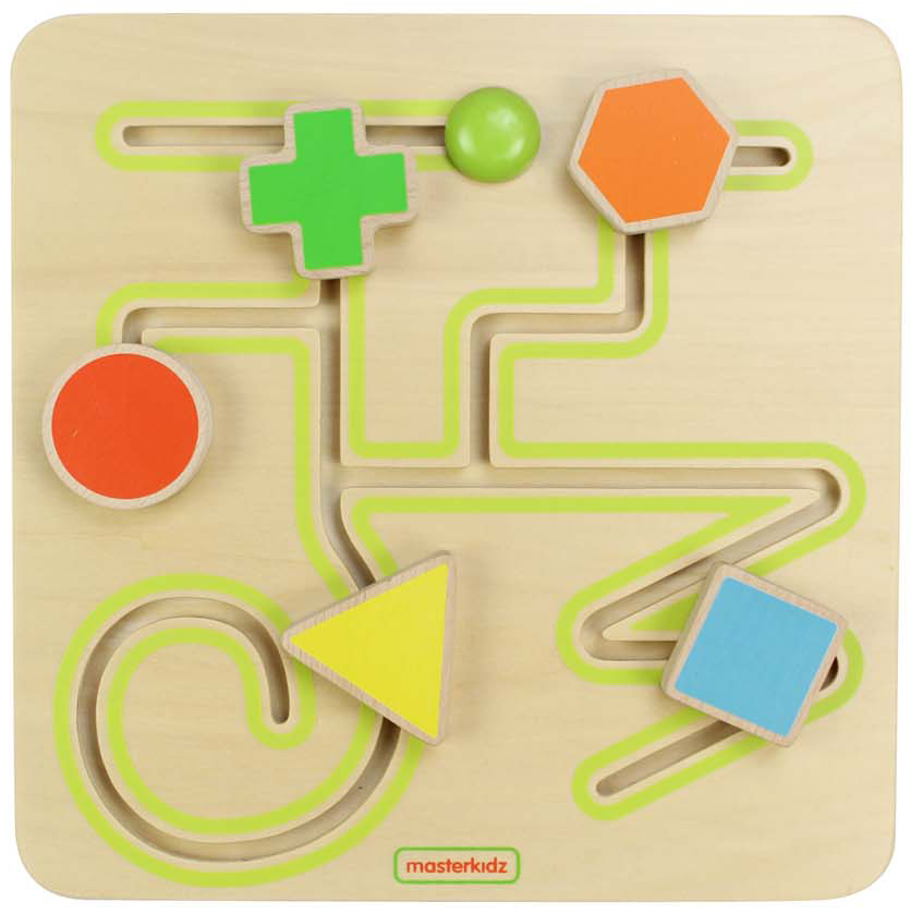 Панель представлена в виде лабиринта с цветными передвигающимися геометрическими фигурами (треугольник, квадрат, круг, крест, шестиугольник) по различным линиям. В процессе игры, ребёнок может задействовать две руки одновременно, что способствует развитию правого и левого полушарий мозга. Это простая доска для тренировки мелкой моторики, состоящая из 5 слайдеров различной геометрической формы. Маленькие ручки могут легко держать их и перемещать по рельсам. Формы улучшат распознавание цветов и форм, а формы дорожек предназначены для раннего развития навыков письма. Простая, но важная обучающая доска для малышей на раннем этапе развития