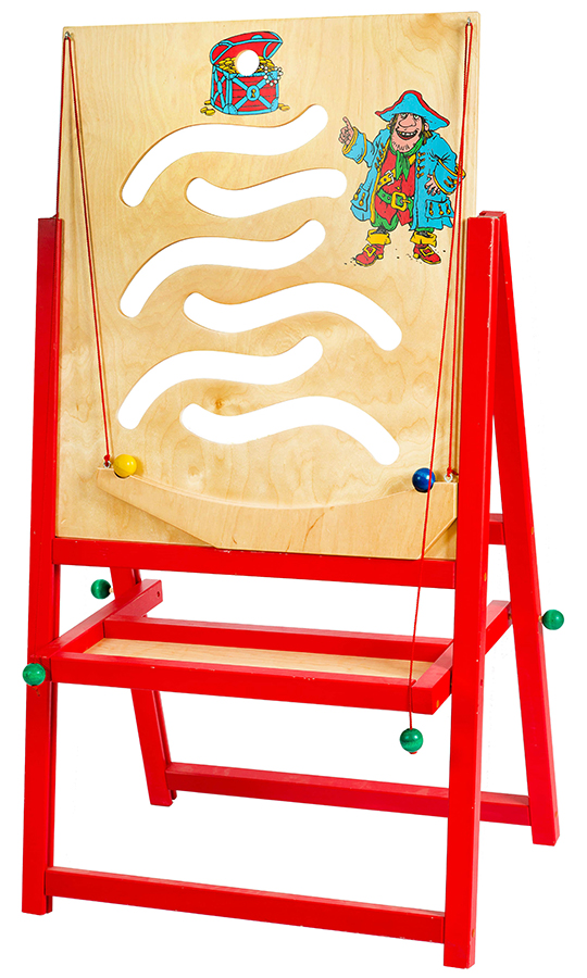 Игровая панель "Пират" представляет собой плоский деревянный экран размером 57 х 68 см с игровым оборудованием и оснащением, предполагающий игры с сюжетами и заданиями. Устанавливается экран на подставку с четырьмя ножками (для напольных или настольных моделей). Общий размер панели на напольной подставке: 120 х 63 см. С помощью специальной планки высоту панелей можно по желанию варьировать. На имеющейся под экраном панели полочке располагаются дополнительные материалы для игры. Панель изготовлена из экологически чистых материалов. Игры с панелью "Пират" развивают у детей мелкую моторику, координацию движений, двигательную память, глазомер, ловкость. "Добывая клад", ребенок тренирует свою выдержку и силу воли, у него появляется стремление достичь результата На панели с «экраном» красочно изображены персонажи: слева сбоку лев, снизу справа — охотник и вверху — его замок. Внутри панели сделаны круглые сквозные прорези и нанесен рисунок охотничьей тропы, по которой нужно провести «охотника», спрятавшегося в укрытие, к логову «льва». У «охотника» имеется «пуля» — это может быть шарик или колечко. «Охотник» в «укрытии» с пулей — это полая треугольная формочка с шариком внутри, подвешенная снизу на 2 шнурах.