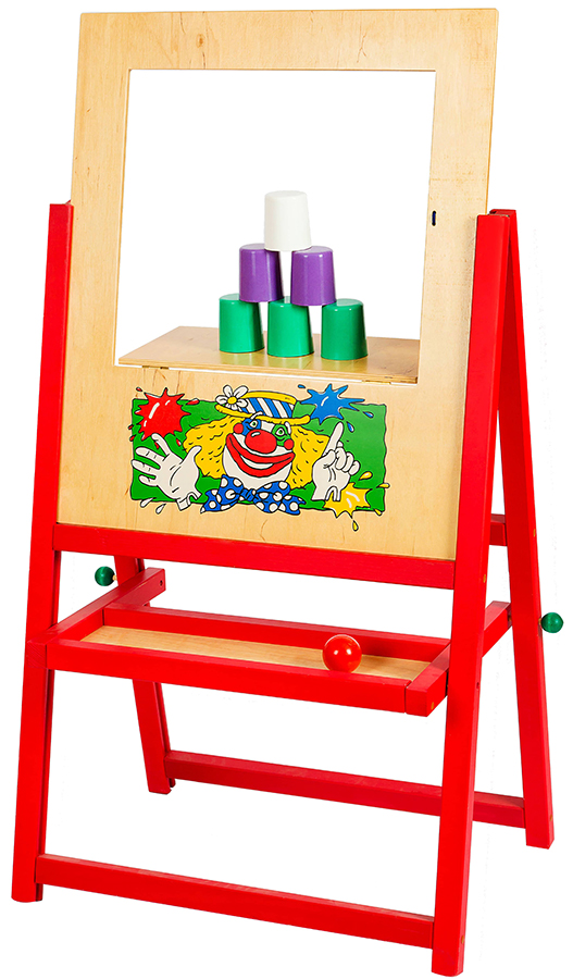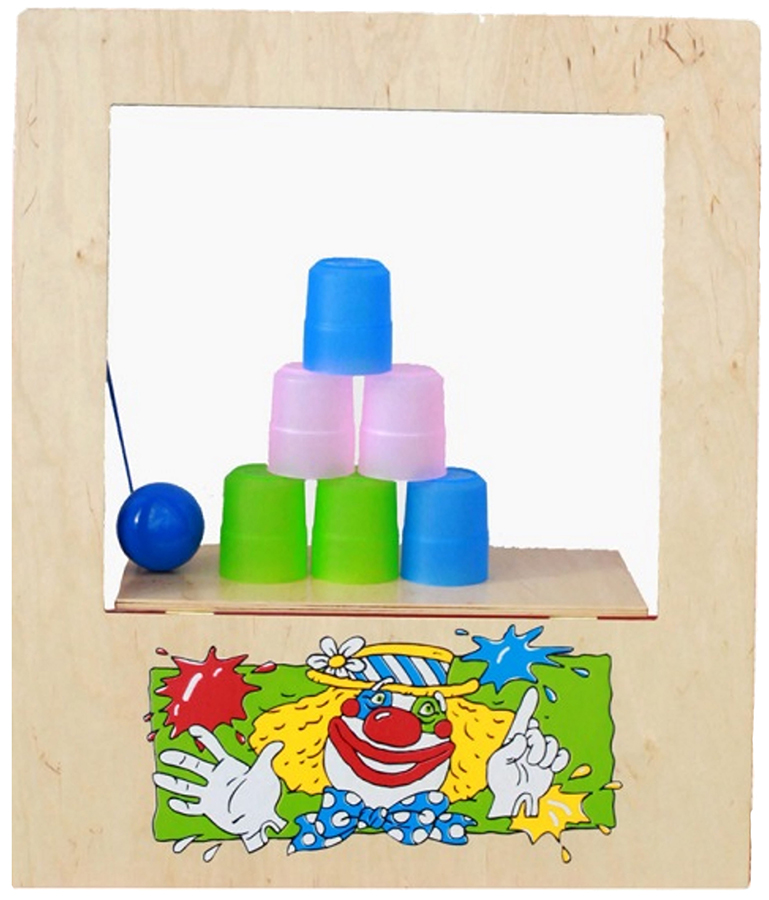 Игровая панель "Тир-Театр" представляет собой экран стандартного размера 57х68 см с откидным «окном – стойкой». На стойке в виде полки помещаются легко сбиваемые «мишени» - 5 стаканчиков. В комплект входят 3 разноцветных пластиковых мячика для стрельбы по мишеням. Веселый, забавный клоун, изображенный снизу «экрана», словно приглашает к состязанию в меткости. Малышей можно учить различным способам игры в команде - группе, например, умению рассчитываться, чтобы соблюдать очередь и не ссориться, действовать по свистку или команде. Предложите детям поиграть в следующие игры: «Кто ловчее», «Кто самый меткий», «Меткий стрелок». Для детей после 6-ти лет и старше рекомендуется наклеить на стаканчики цифры и вести подсчет очков по сумме чисел на сбитых стаканчиках. Дети 7-8 лет могут играть командами и подсчитывать очки, набранные командой. Расстояние до мишеней в соответствии с возрастом игроков должно постепенно увеличиваться - от 1 м до 3-4м. Командные игры: «Чья команда наберет больше очков», «Кто попадет в цель с 3, 4 , 5 метров», «Кто наберет больше очков за 5 или 7 минут». С помощью игровой панели "Тир-Театр" ребенок может тренировать мелкую и крупную моторику, двигательную память, координацию движений, настойчивость, ловкость, меткость, точность глазомера и внимательность, а также совершенствовать свои счетные умения.