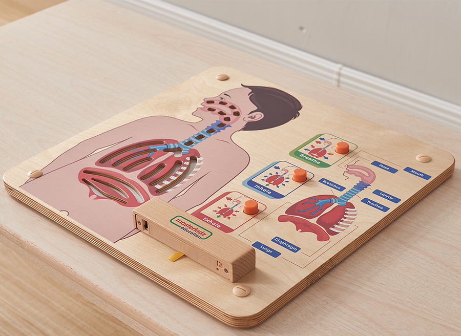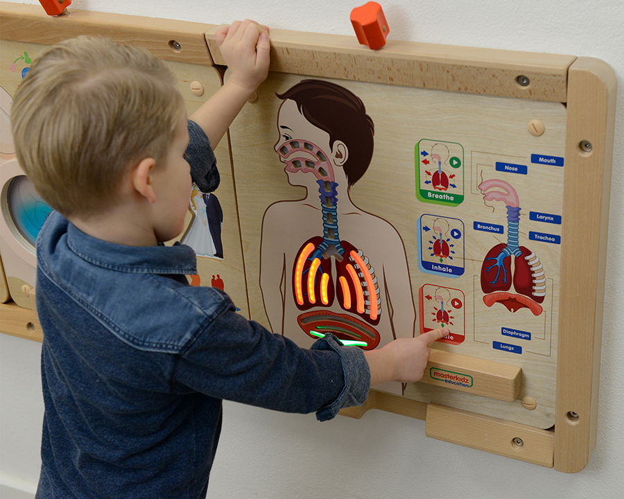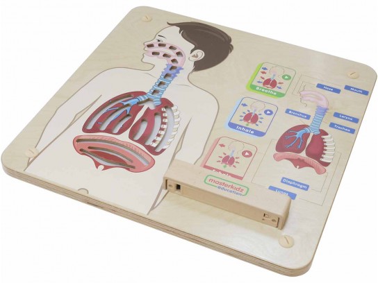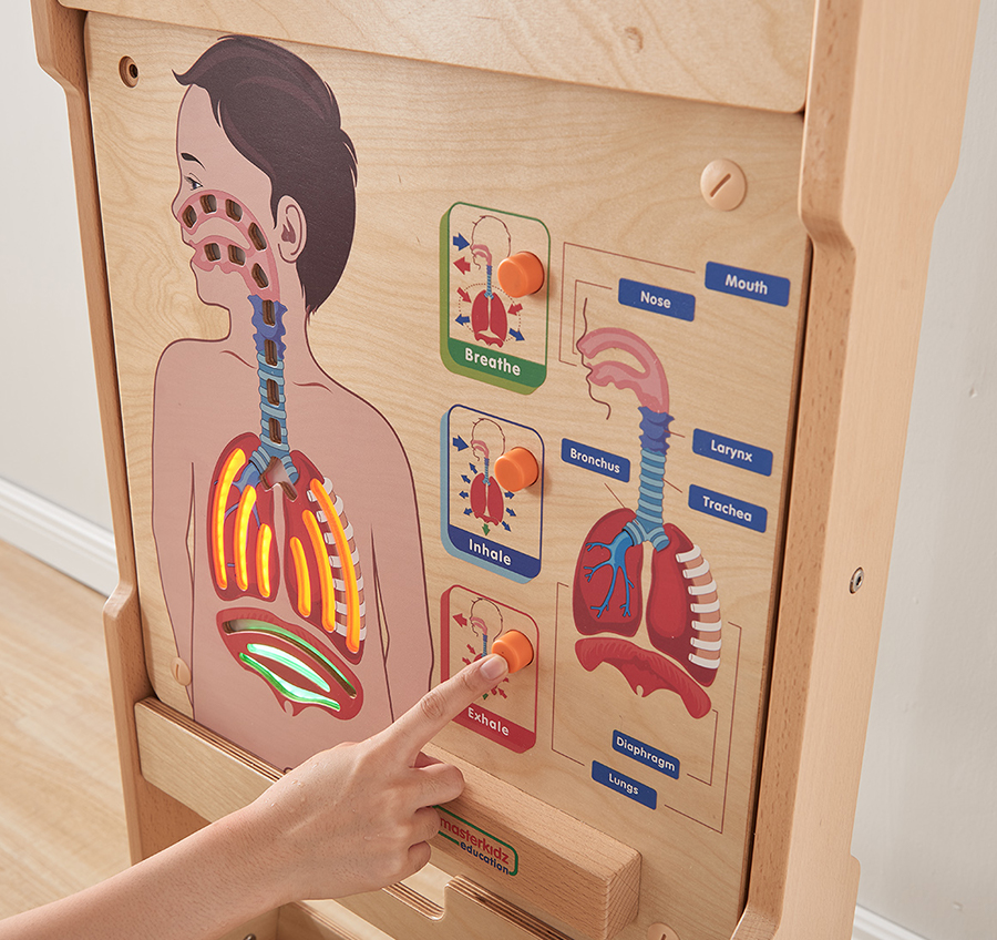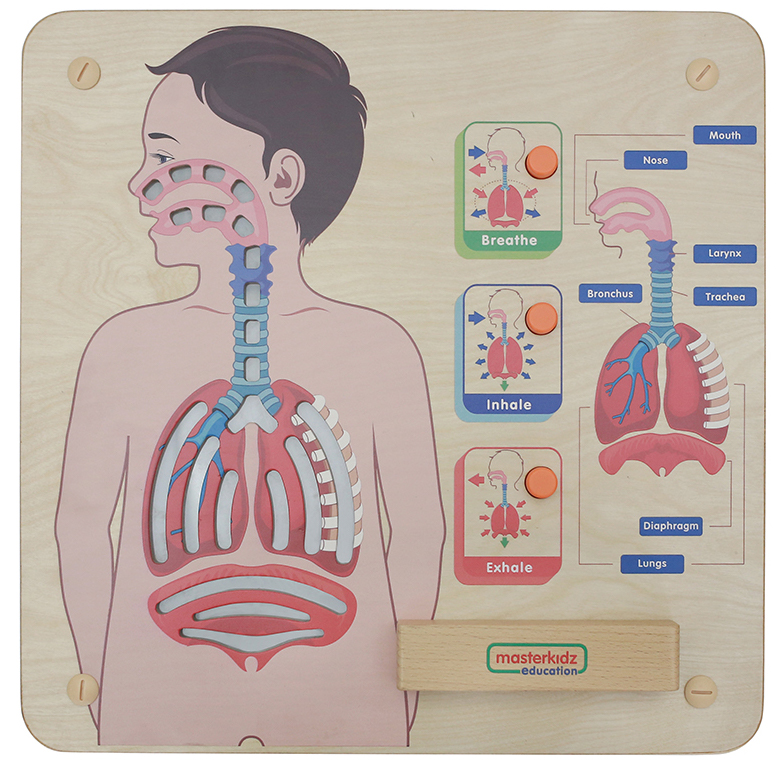 Дыхательная система — это группа тканей и органов в организме, которые позволяют нам дышать. Основными органами дыхательной системы являются рот и нос, дыхательные пути, легкие и диафарма. При нажатии кнопки «Вдох» (англ/яз) световые короба загораются и начинают течь, демонстрируя процесс вдоха: диафрагма опускается вниз, легкие увеличиваются, и воздух поступает в легкие. При нажатии кнопки «Выдох» (англ/яз) диафарм поднимается вверх, легкие уменьшаются в размерах и воздух начинает выходить из тела человека. Кнопка «Дышать» (англ/яз) используется для демонстрации всего процесса дыхания. По углам панели размещены отверстия для крепления. Дыхательная система состоит из взаимосвязанных компонентов, которые позволяют нам вдыхать и выдыхать. К ним относятся рот, ноздри, дыхательные пути, легкие, кровеносные сосуды и диафрагма, которая движется вверх и вниз, позволяя легким расширяться и сжиматься. Когда мы вдыхаем, из воздуха удаляется кислород и выдыхаются другие отходящие газы. Учебная доска четко показывает и маркирует эти компоненты, а при нажатии кнопок (вдох, выдох, вдох) индикаторы освещают функции этих частей, обеспечивая четкое графическое представление процесса Размер 46х46 см В комплекте идут инструкция по сборке, набор для монтажа (винты, ключ для монтажа, пластиковые пробки).