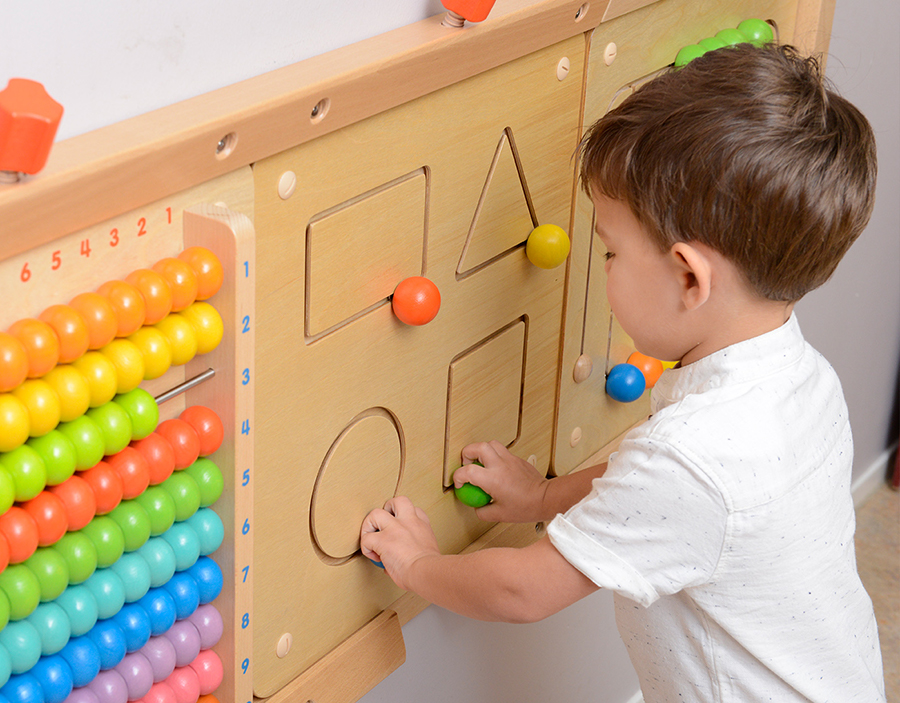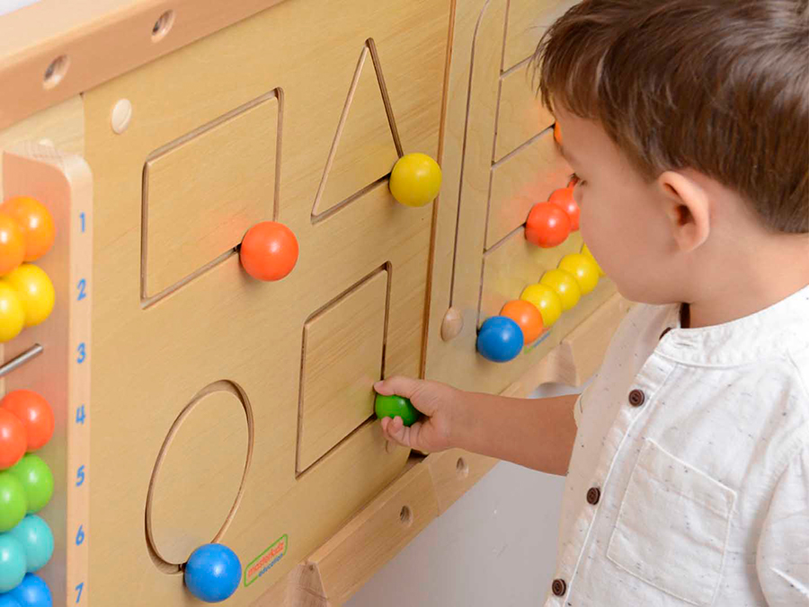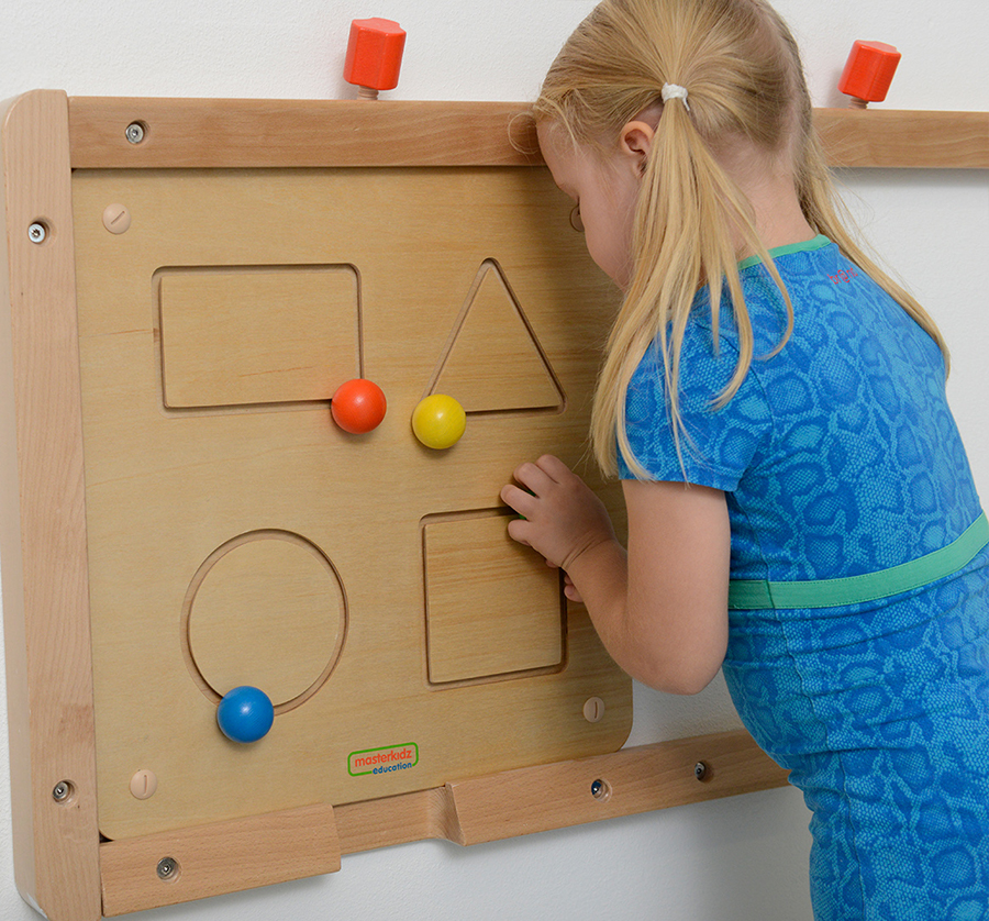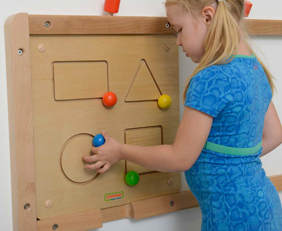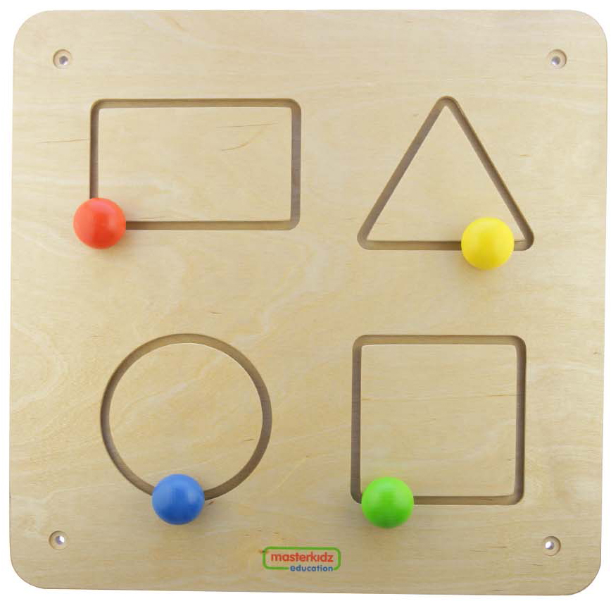 Панель выполнена из березовой фанеры. Размер 46х46 см. На лицевой поверхности панели выполнены прорези в виде геометрических фигур (квадрат, треугольник, круг, четырехугольник) и в них подвижно закреплены 4 разноцветных шарика. По углам панели размещены отверстия для крепления панели к стене. Эта доска с скользящими геометрическими фигурами помогает развивать мелкую моторику. Он также закрепит названия четырех наиболее распространенных математических фигур, что позволит детям видеть и чувствовать их посредством кинестетической игры. Четыре ручки основных цветов также можно использовать в играх, связанных с распознаванием цвета и формы. Доску можно закрепить на стене или гибко использовать с системой крепления Masterkidz STEM WALL на отдельно стоящем окне для рисования. Изготовлен из фанеры бука FSC.
