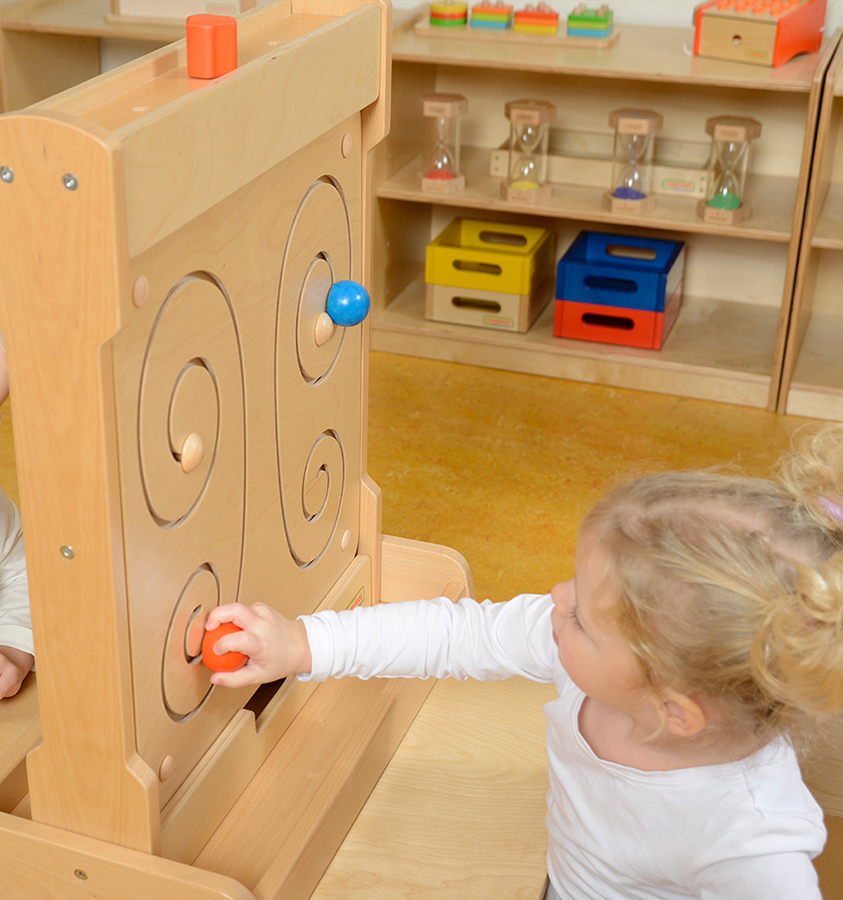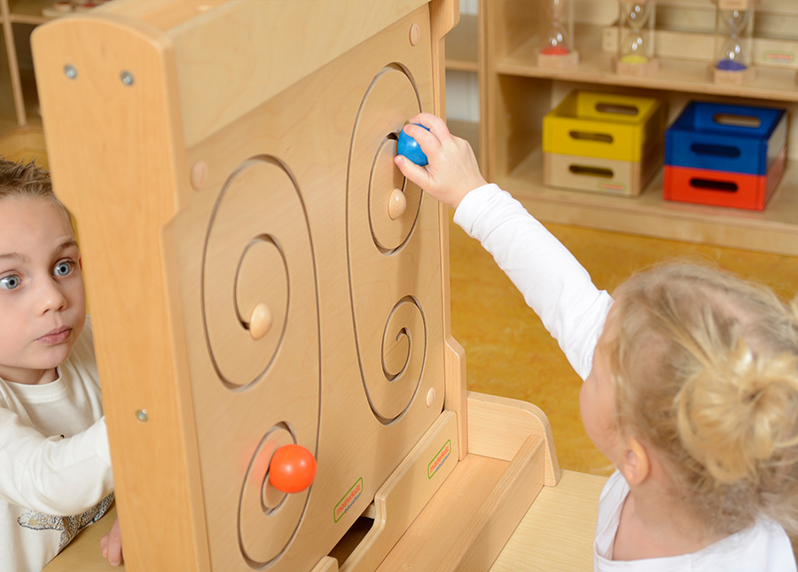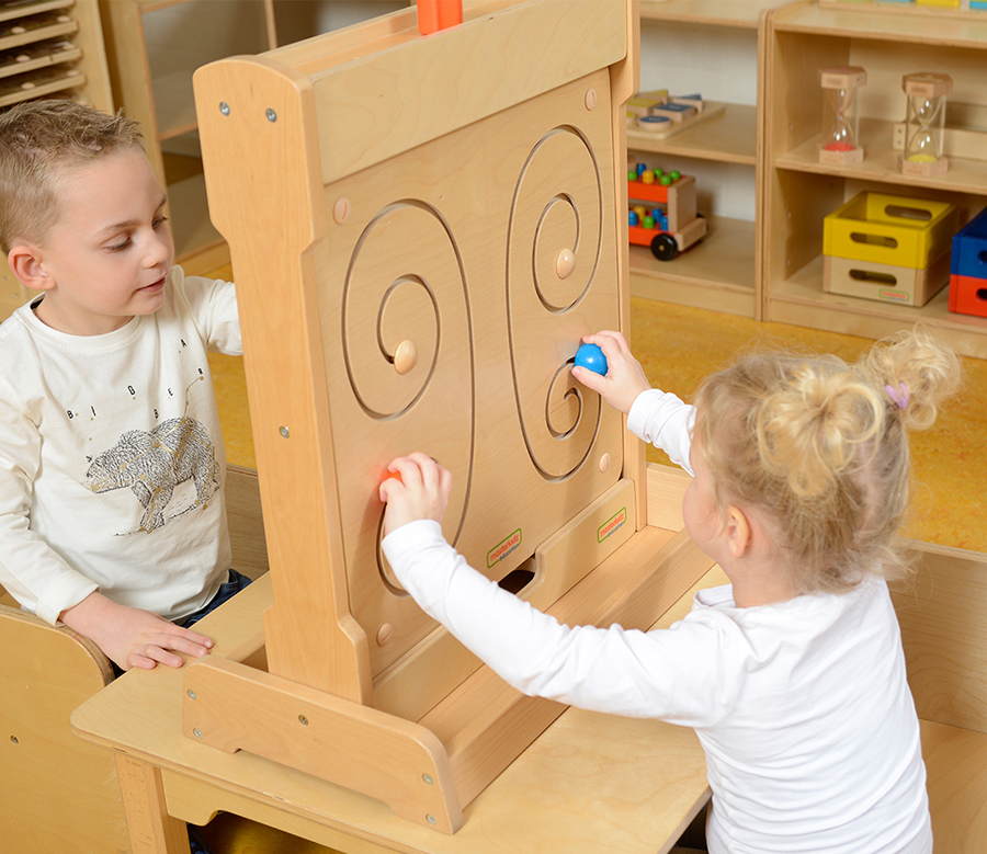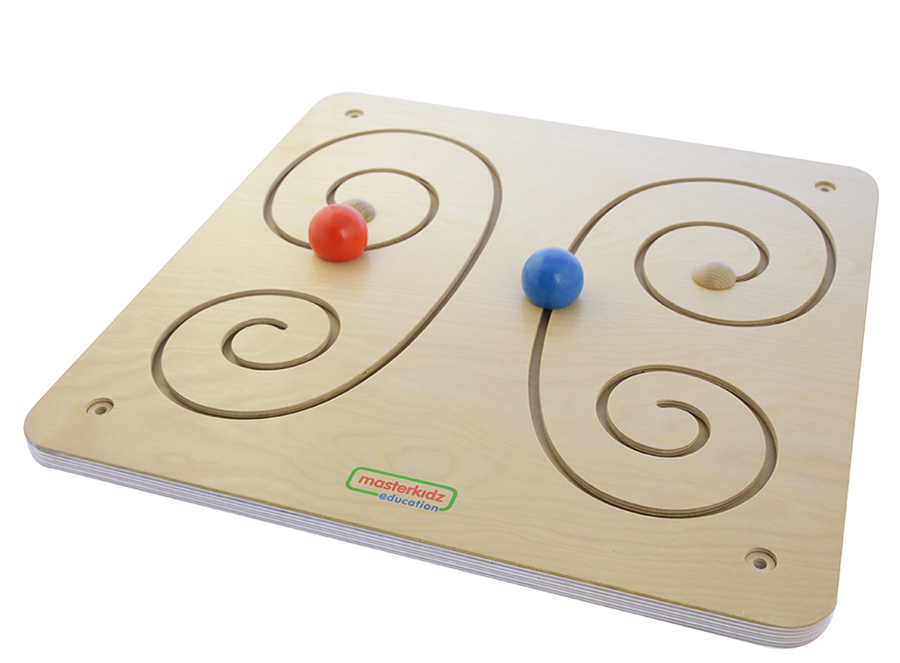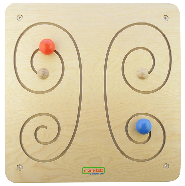 Настенная панель выполнена из березовой фанеры. На лицевой поверхности панели имеются 2 прорези-углубления - лабиринты в виде крыльев бабочки, в прорезях подвижно закреплены 2 шарика красного и синего цвета, в начальной точке лабиринтов - прорезей имеются заглушки для изъятия шариков. Общий размер 46х46 см. В скользящем лабиринте в форме бабочки используются противоположные кривые со спиралями с отражающей симметрией, создающие эффект крыла бабочки. Дети могут одной рукой обвести форму одной кривой, а затем повторить это отдельно другой рукой, переходя к использованию обеих рук одновременно. Это поможет улучшить координацию левой и правой руки. Его можно закрепить на СТЕНЕ STEM или использовать с отдельно стоящим окном для покраски. Изготовлен из европейской фанеры FSC