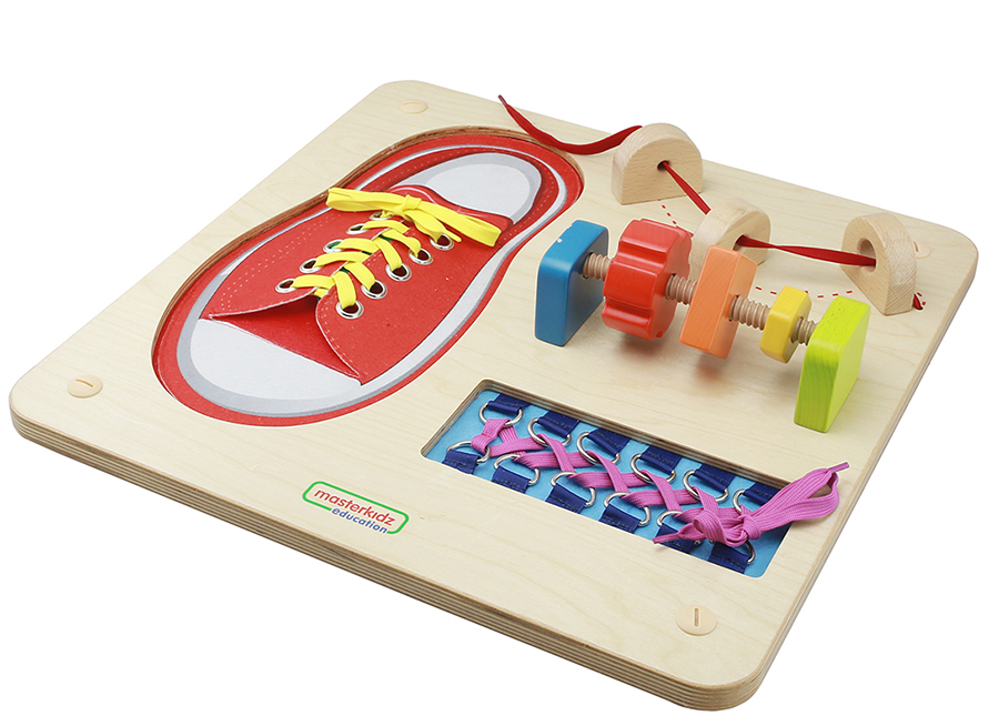 Панель выполнена из березовой фанеры. На лицевой поверхности панели выполнено углубление, в котором зафиксирован макет обуви со шнурком для изучения различных методов шнуровки. В верхней правой части расположены выступы в форме полукруга в количестве 3 шт., ниже на выступах расположен шкив с резьбой, на котором перемещаются 3 фигуры разных форм. В нижнем правом углу расположено углубление, в котором вмонтированы металлические кольца в количестве 12 штук, через которые продевается шнурок для изучения различных методов шнуровки. Доска для развития мануальной ловкости III содержит 4 задания, которые помогут улучшить зрительно-моторную координацию и мелкую моторику ребенка. Винты разных размеров и цветов можно вращать и перемещать по стержню с резьбой. Шнурки можно продеть через обручи. Большой ботинок со шнурками для завязывания бантика и тремя фигурными блоками усложняет задачу точной заправки ниток