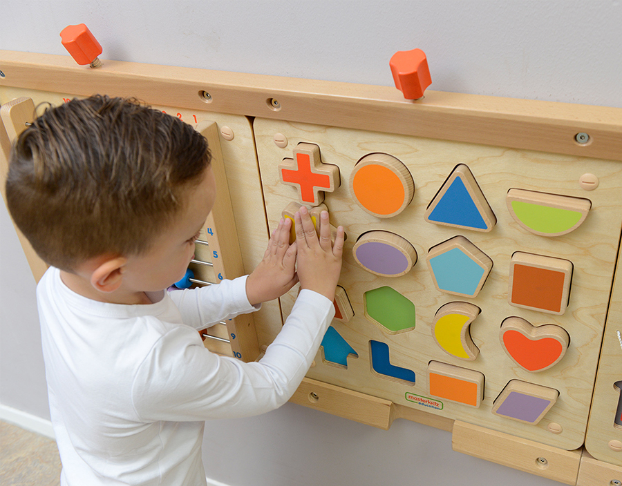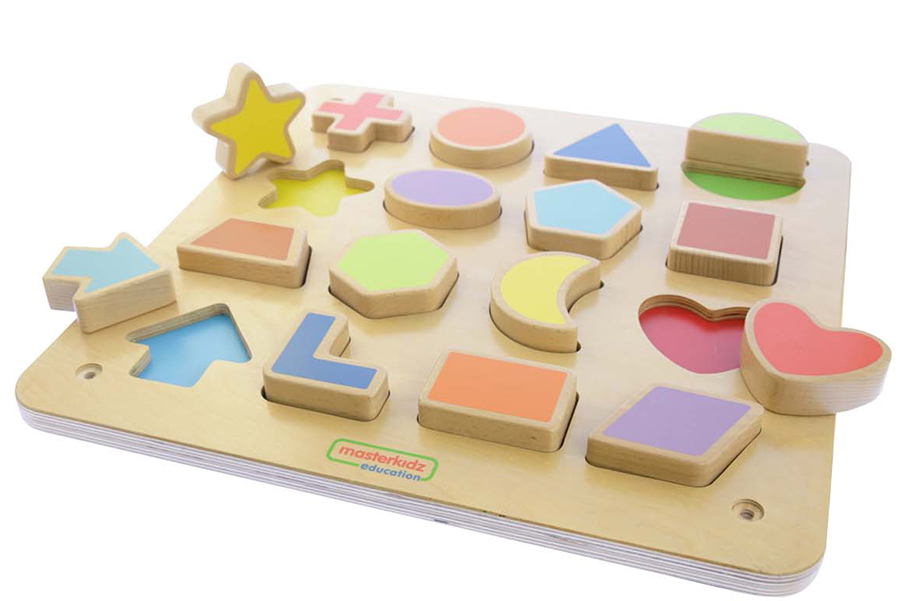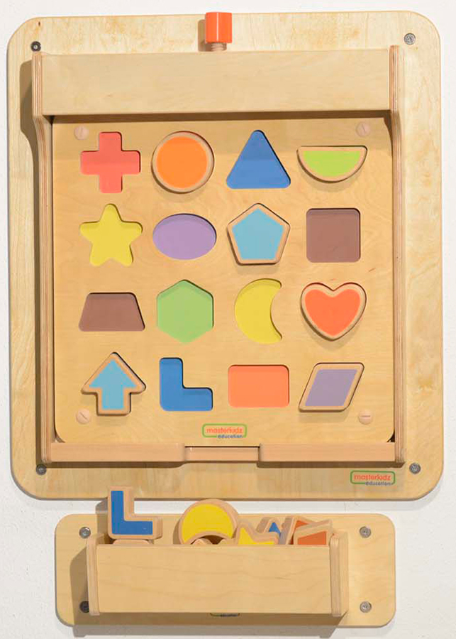 Интерактивная доска-панель выполнена из березовой фанеры, на лицевой части которой выполнены углубления, в которые вставляются фигуры различной геометрической формы. Формы выполнены в 16 разных цветах. Общий размер 46х46 см. На магнитной доске для сопоставления фигур имеется 16 различных фигур разных цветов. Поскольку детям необходимо определить форму, чтобы взять ее, сориентировать и разместить в правильном месте на доске, это действительно поможет их мелкой моторике и зрительно-моторной координации. Есть некоторые распространенные и необычные формы, которые помогут в развитии математического словаря. Доска магнитная, поэтому фигуры останутся на месте, даже если ее закрепить на стене (или использовать на отдельно стоящем окне для рисования Masterkidz). Изготовлен из фанеры европейского бука FSC