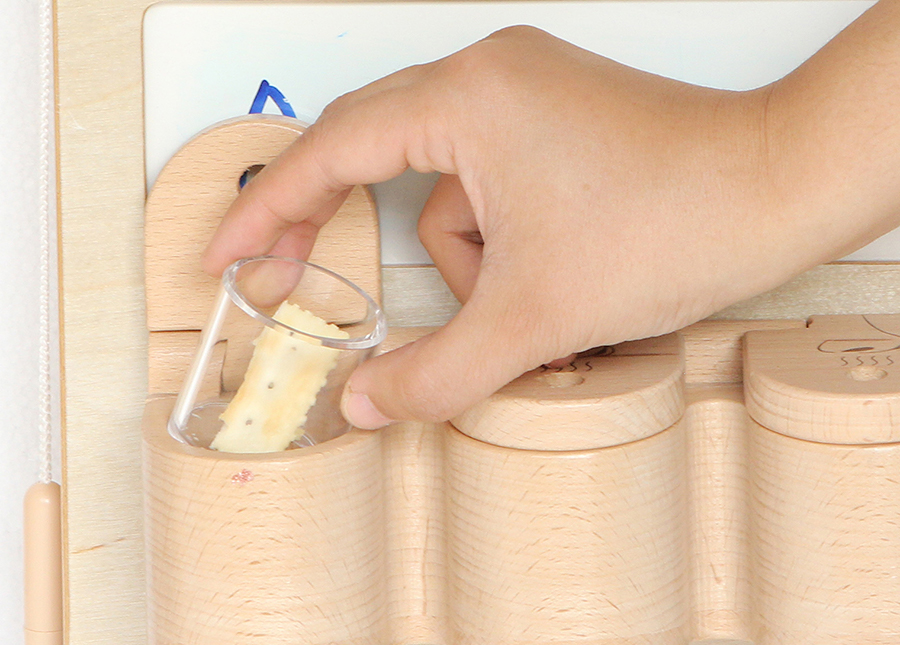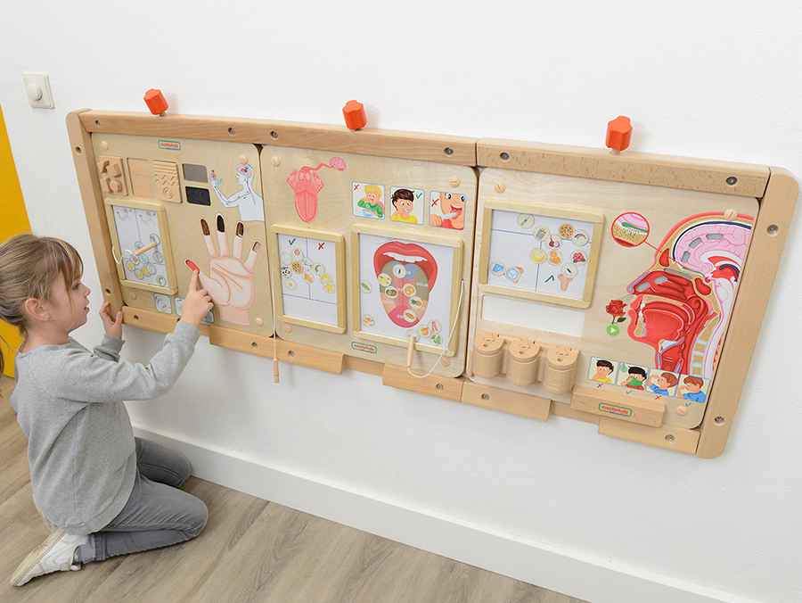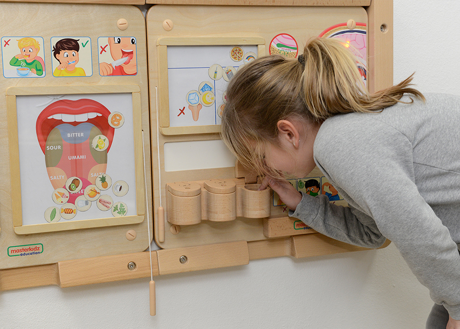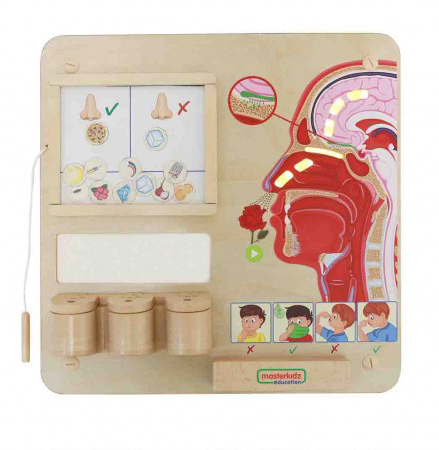 Настенная панель выполнена из березовой фанеры, на лицевой стороне которой расположен макет носа. Когда ребенок дотрагивается до цветка, виден имитированный поток запаха от цветка к носу. Затем запах превращается в сигнал и передается в мозг. Поток запаха и сигнала достигается за счет освещения ряда светодиодов. В нижней части панели есть три деревянных отделения, в каждом из которых находится акриловый лоток, в которые можно поместить разные предметы для определения запаха веществ. Наше обоняние исходит от небольших рецепторов внутри (вверху) нашего носа, которые передают сообщения непосредственно в наш мозг. На обучающей доске есть кнопка, при нажатии которой отображается поток аромата цветка, обнаруживаемый носом, и сообщения, отправляемые в мозг. Мы можем различать сильные или слабые, приятные или неприятные запахи. В 3 отделения в нижней части доски помещаются различные предметы, которые учитель помещает в них, например, фрукты, цветы, специи или духи, чтобы дети могли их понюхать. Интерактивная таблица предлагает детям разделить объекты на вещи, которые мы можем и не можем чувствовать по запаху, а изображения будут способствовать разговору на эту тему, развивая словарный запас детей