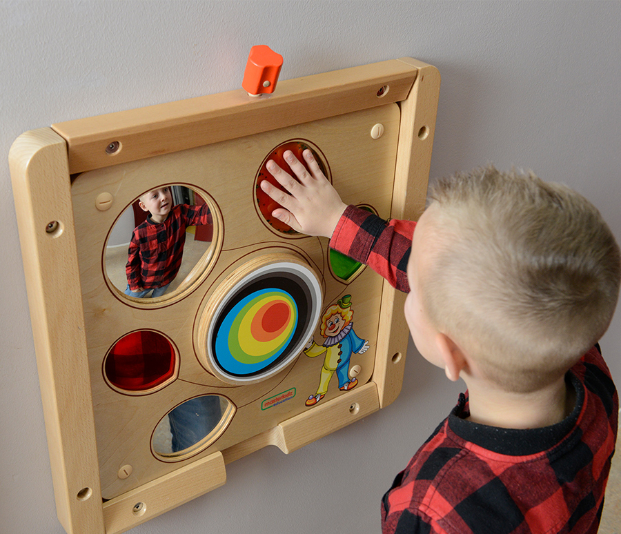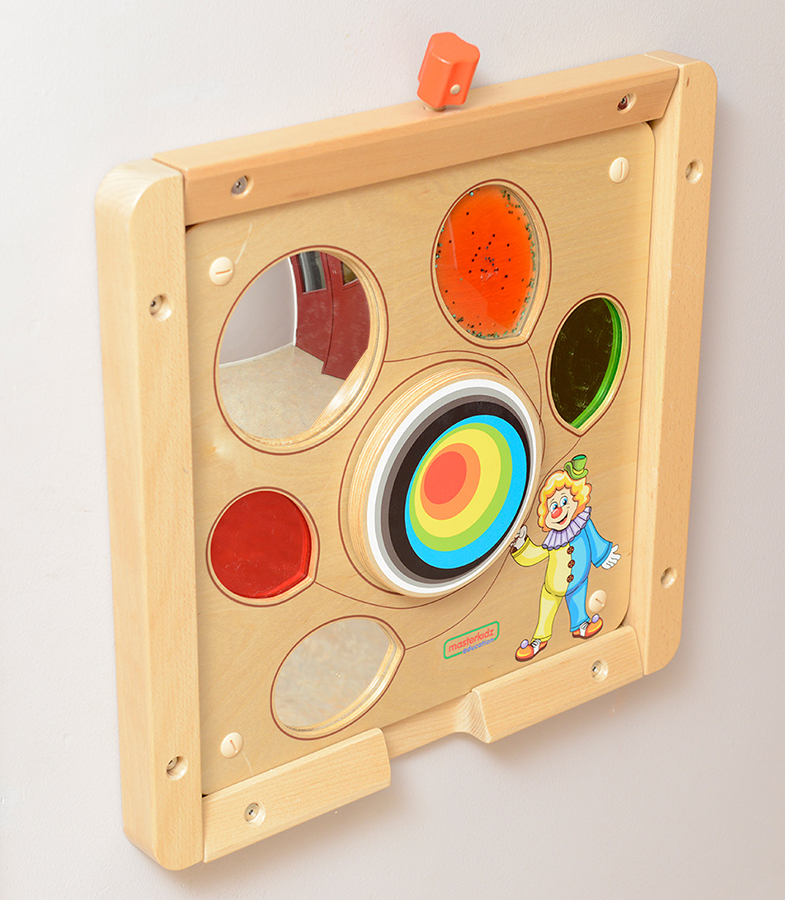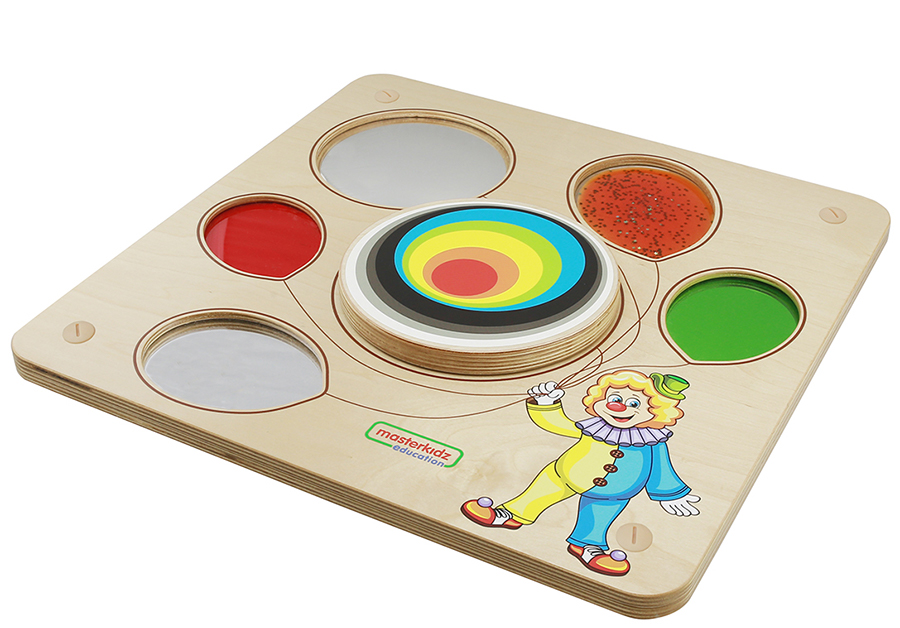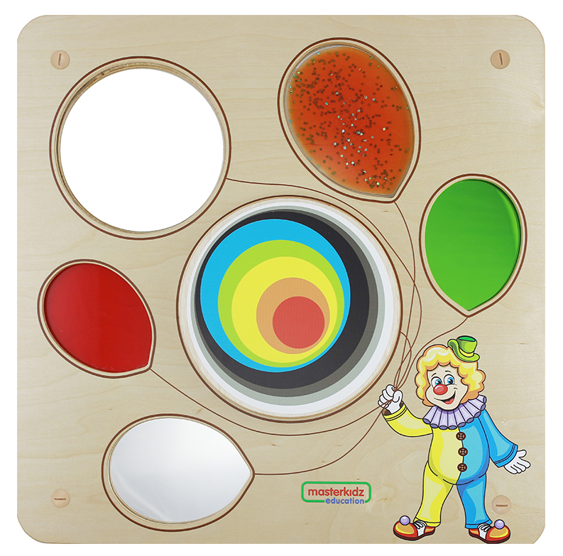Основание настенной панели выполнено из березовой фанеры, на лицевой части которой расположены следующие элементы: зеркало, цветное отражение, вогнутое зеркало, тактильные окна, вращающее колесо. Способствует развитию мелкой моторики, сенсорики и концентрации внимания. Эта сенсорная обучающая доска с визуальной темой клоуна, держащего разноцветные воздушные шары, предлагает целый ряд интерактивных возможностей обучения. К ним относятся элементы визуальной и тактильной сенсорной тренировки, такие как зеркало, вогнутое зеркало, цветная отражающая панель и вращающееся колесо посередине. Эта доска предлагает так много возможностей, что обеспечивает высокую степень практической сенсорной стимуляции