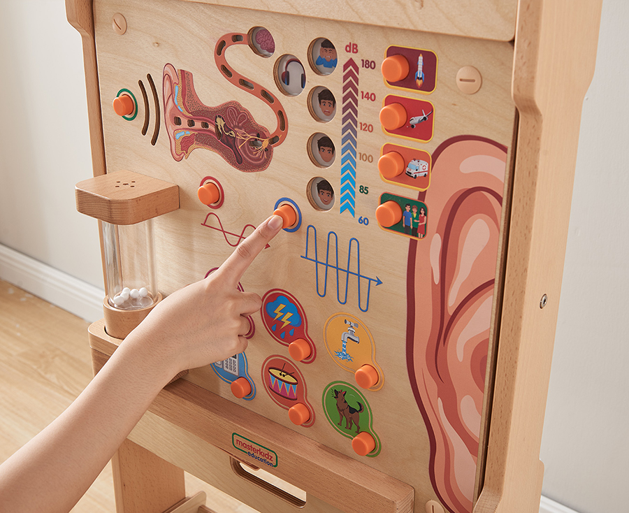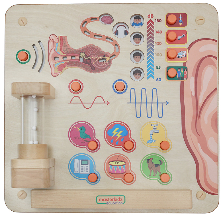 Настенная панель выполнена из березовой фанеры, на лицевой части которой расположена игра с изображением различных звуков людей, животных, птиц, техники. Есть кнопки высокого и низкого тона звука. Глядя на диаграммы звуковых волн, дети могут понять разницу между ними. На панели есть прозрачная акриловая трубка, внутри которой пенистые шарики. В зависимости от громкости звука дети наблюдают различные степени вибрации шариков. Наше чувство слуха можно глубже изучить с помощью этой интерактивной обучающей доски. Звук распространяется по воздуху в виде невидимых волн, но их можно наблюдать, когда звуковые вибрации ударяются о крошечные шарики в прозрачной трубке на передней части доски. Кнопки также позволяют ребенку исследовать различные характеристики звука, включая громкость, высоту и разнообразие звуков, которые мы можем идентифицировать, например лай собаки, пение птиц и бег воды. Представлено представление о внутреннем ухе, о том, как собираются звуки, а также о том, как крошечные вибрации отправляются в мозг в качестве сообщений для идентификации. Когда звуки становятся слишком громкими, доска показывает нам, что необходимо защитить уши, надев защитные наушники.