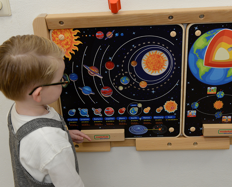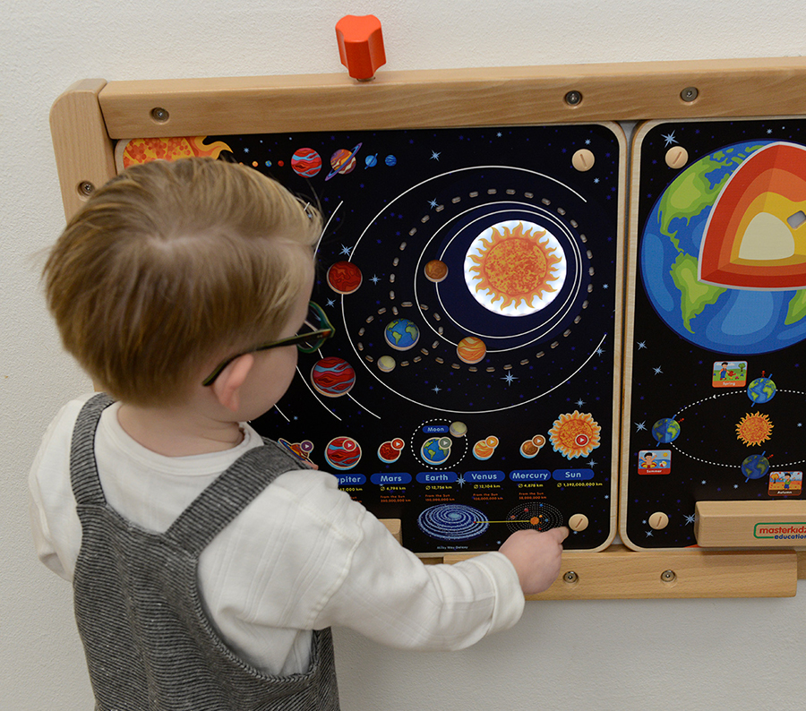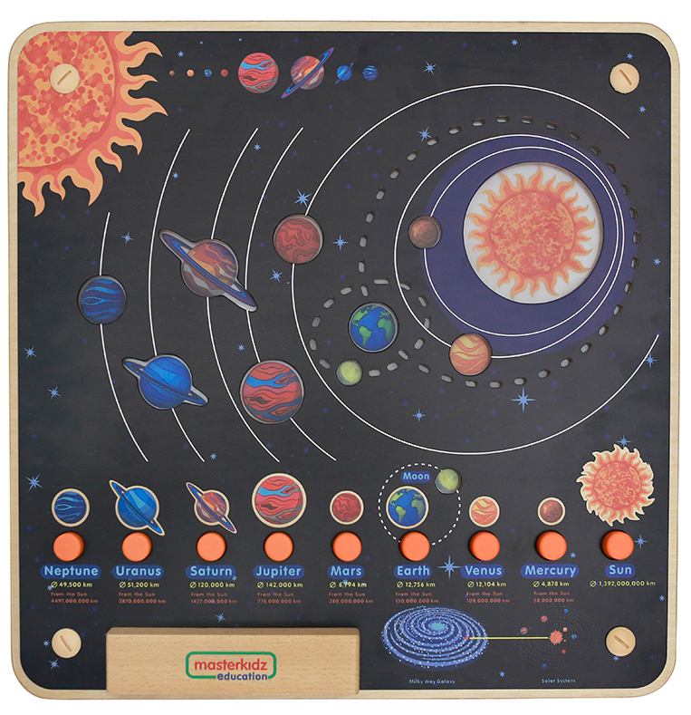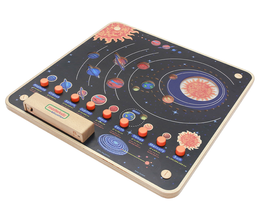 Основание настенной панели выполнено из березовой фанеры, на лицевой части изображена солнечная система. Световые эффекты демонстрируют движение планет. Вокруг изображений Земли и Луны светодиодами выполнена их орбита. В нижней части панели отображены все 8 планет и Солнце. При нажатии на конкретную планету, на верхней схеме загорается нужная планета. На учебной доске Солнечной системы показано Солнце в центре и 8 планет (Меркурий, Венера, Земля, Марс, Юпитер, Сатурн, Уран и Нептун), включая вращающуюся вокруг него Землю. Меркурий находится ближе всего к Солнцу. Нептун самый дальний. Дети смогут увидеть, в каком порядке они появляются, их относительный размер и цвет, расстояние до Солнца и место Земли на картинке. В нижней части доски появляется название и изображение каждой планеты, а сенсорная кнопка подсвечивает их на большой схеме солнечной системы. При нажатии кнопки «Земля» Земля подсвечивается (показывая, что она вращается вокруг Солнца в то же время, когда Луна вращается вокруг Земли). Первый инструмент изучения Солнечной системы, который вызовет интерес у многих начинающих астрономов