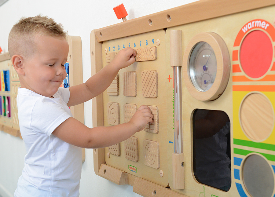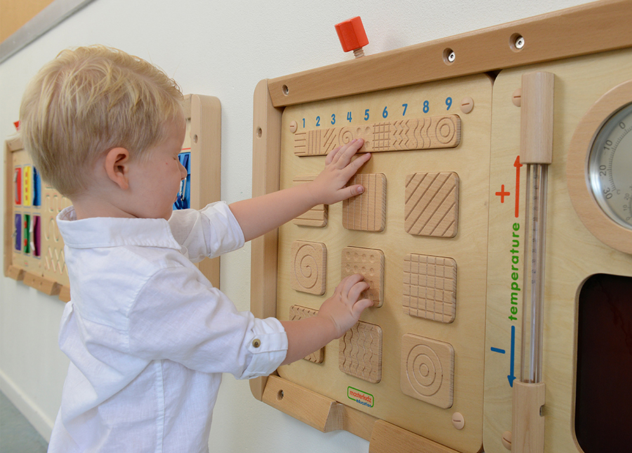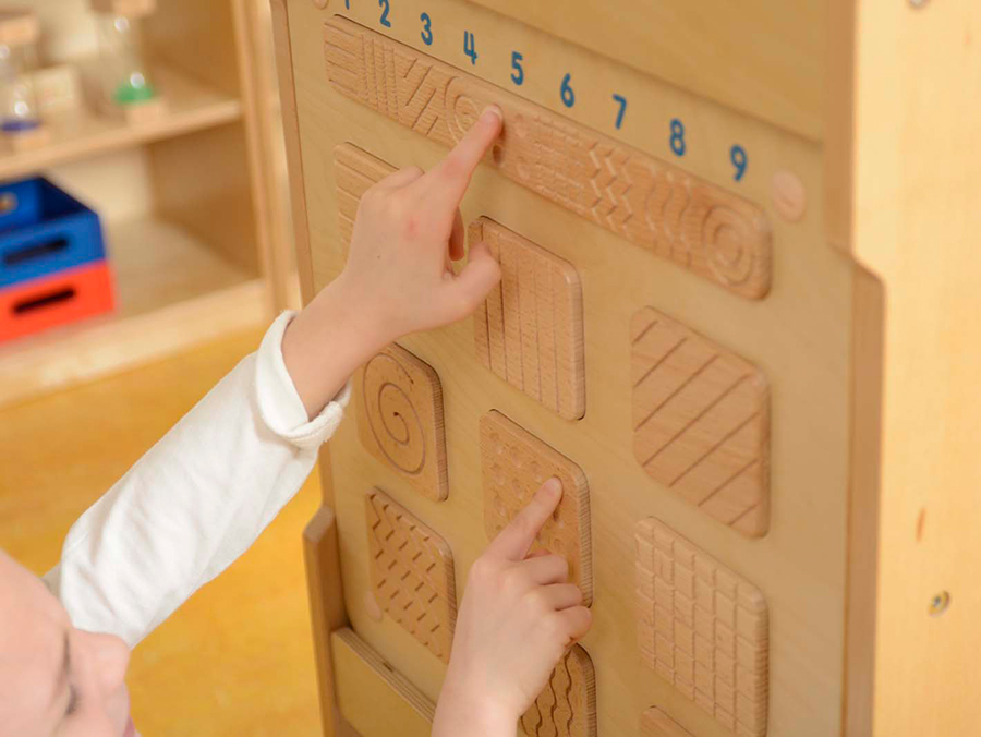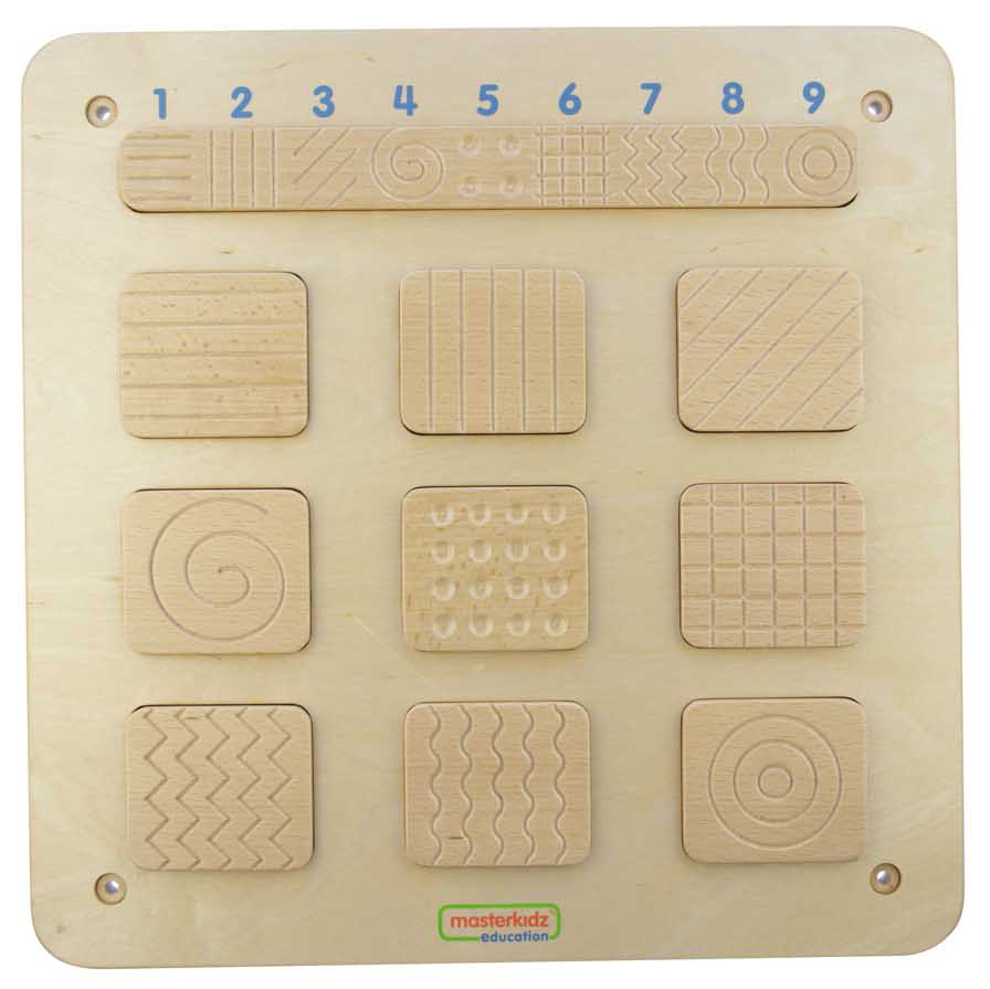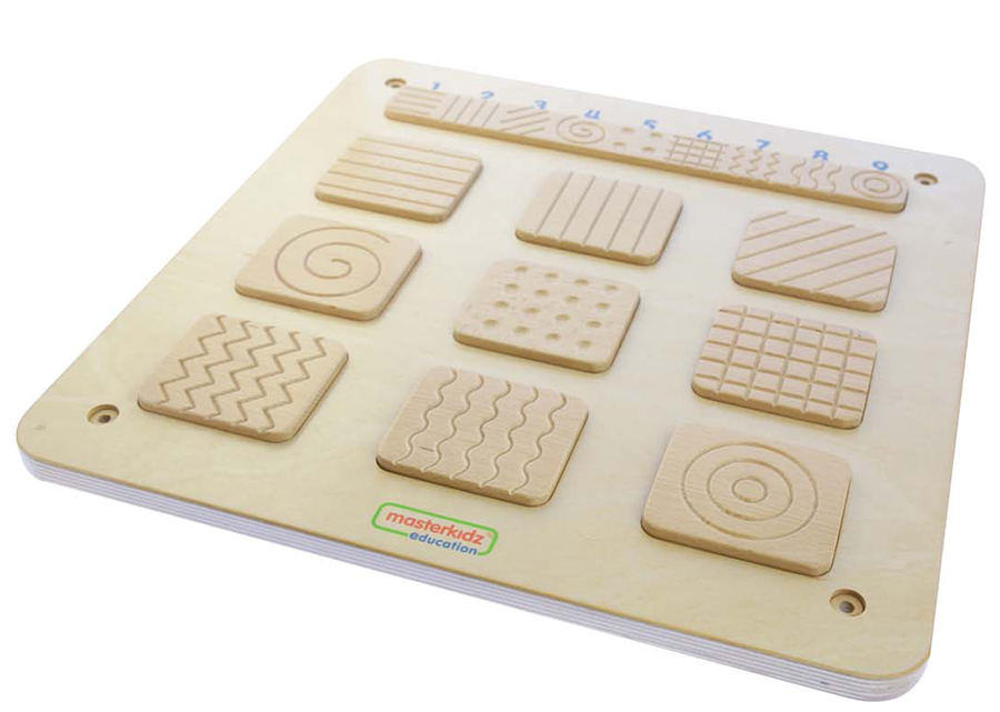 Настенная панель выполнена из березовой фанеры. На лицевой части в больших прямоугольных углублениях расположены 9 образцов деревянных блоков с различной текстурой поверхности для тренировки тактильных навыков. В верхней части расположены схожие образцы текстурных поверхностей, над которыми изображены цифры от 1 до 9. По углам панели размещены отверстия для крепления панели к стене. Детям необходимо, дотрагиваясь пальчиками, правильно сопоставить текстуру блоков с полосой в верхней части панели, при этом словесно описывая свои ощущения. Доска с 9 различными текстурами поверхности, способствующими обучению посредством осязания. Дети могут сопоставить каждый блок с соответствующей полосой текстуры в верхней части доски. Учителя могут попросить детей потрогать, пощупать и описать текстуру, чтобы способствовать лучшему словесному выражению и развитию речи. Доску можно использовать при установке на СТЕНЕ STEM или с отдельно стоящим окном для покраски. Изготовлен из фанеры. Размер доски 46 х 46см