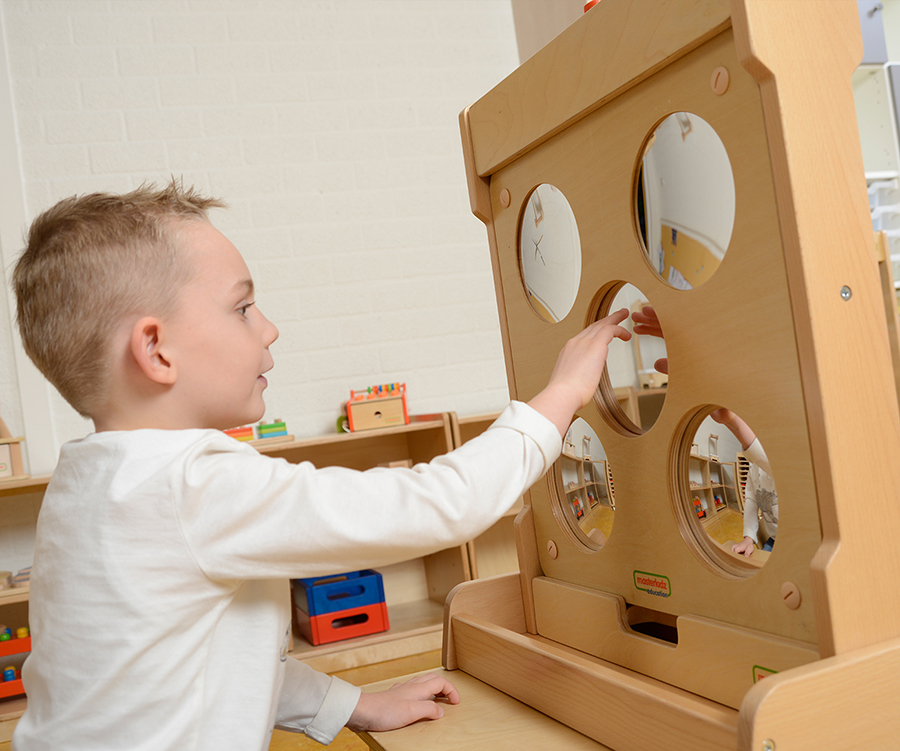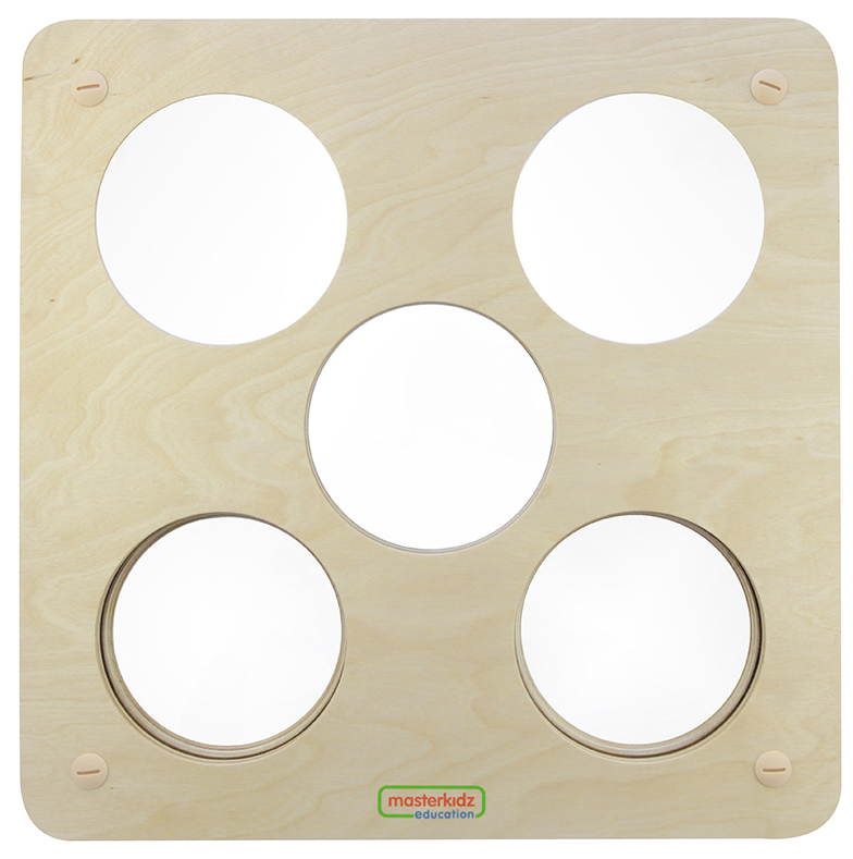 Пособие представляет из себя панель из березовой фанеры, в которую вмонтированы 5 зеркальных круглых поверхностей, с разной степенью кривизны. Общий размер панели 46х46 см. Вставка из массивной деревянной доски с пятью круглыми зеркалами. Используя его, дети будут развивать лучшее самосознание и уверенность в себе. Доску можно использовать при установке на СТЕНЕ STEM или с отдельно стоящим окном для покраски. Изготовлен из фанеры