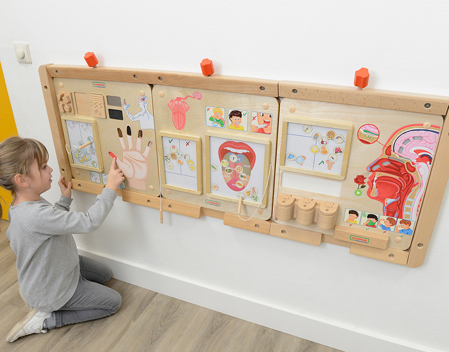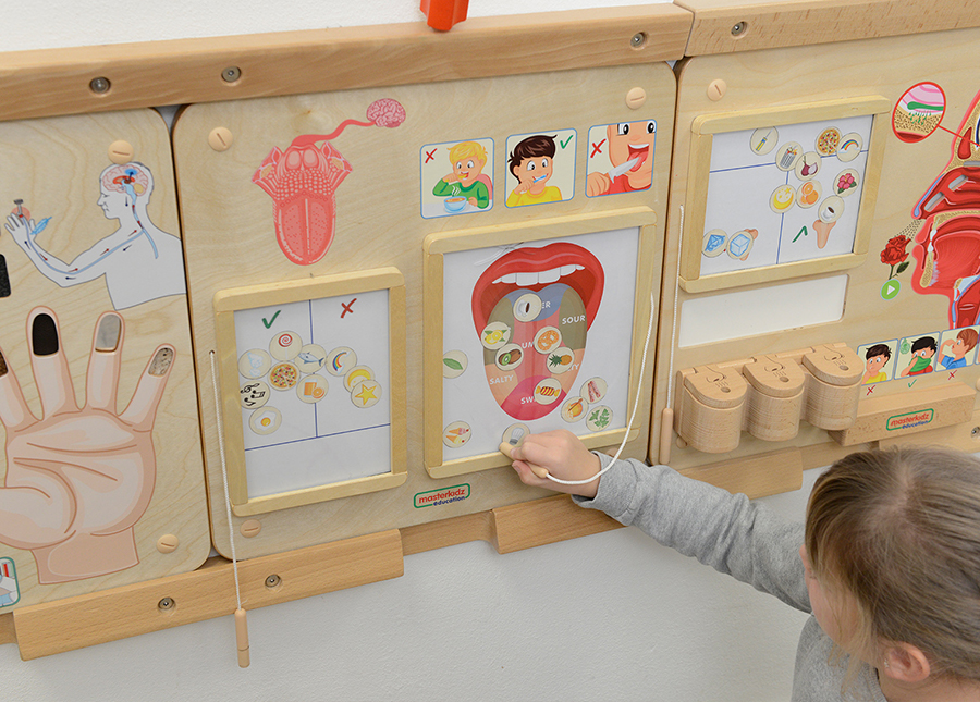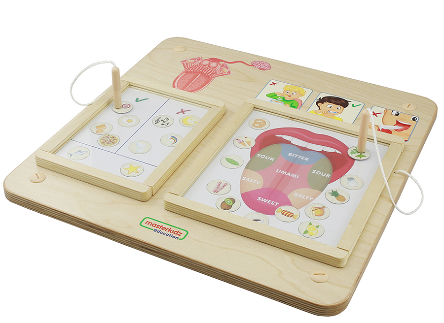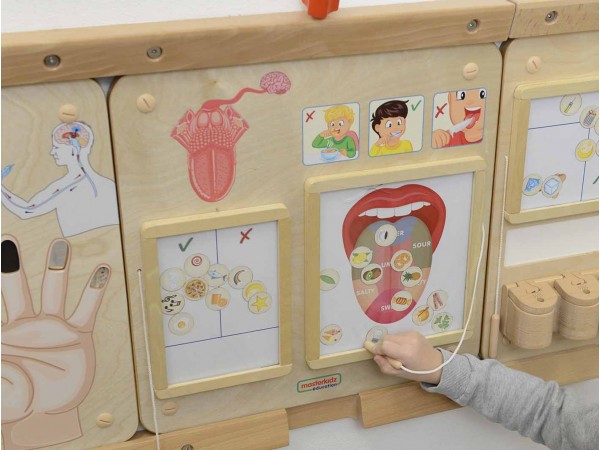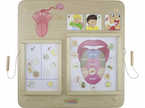 Панель объясняет детям, что с помощью языка мы ощущаем вкус. Есть четыре типа вкуса: соленое, сладкое, кислое и горькое и существуют зоны на языке, ответственные за эти четыре вкуса. Детям смогут поместить магнитные фишки с различнымие продуктами питания в правильные зоны на языке. Наше чувство вкуса глубже изучается с помощью этой превосходной интерактивной обучающей доски. Язык является рецептором вкуса. На поверхности нашего языка расположены вкусовые рецепторы, которые определяют соленость, сладость, кислинку и горечь (а также умами, что означает «суть вкуса», другими словами, хотим ли мы это съесть). Они показаны как участки на языке. Дети могут выбирать магнитные изображения различных продуктов и помещать их на правую часть языка, а также есть панель, на которой дети могут разделить предметы на те, которые можно попробовать, и те, которые нельзя. Например, «Можем ли мы попробовать воду?». Изображения, показывающие связь между языком и нашим мозгом, а также уход за языком, будут способствовать обсуждению и улучшению научных знаний и словарного запаса детей.