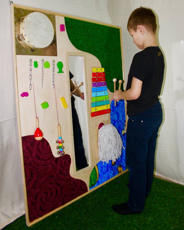 Акустическая тактильная панель сочетает в себе функции тактильной, зрительной и звуковой стимуляции. Предназначена для развития мелкой моторики и игровой терапии. На корпусе панели совмещено множество звуковых и декоративных предметов различных форм и размеров, изготовленных из дерева, ткани, металла, пластика: шурупы, ксилофон, металлофон, трещотки, маракасы, бубенцы. Углы обрамлены материалами различных фактур и формы. Разнообразное наполнение делает эту панель одним из главных элементов Сенсорной и Игровой комнаты. Размеры панели позволяют одновременно играть с ней нескольким детям.