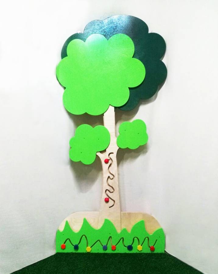 Декоративно-развивающая панель Дерево предназначена для развития у детей мелкой моторики рук, тактильных ощущений, логики и пространственного мышления. Панель выполнена в форме дерева, на стволе которого находятся лабиринты, по которому можно передвигать насекомых и цветочки. Объёмный эффект панели придают несколько слоёв элементов. Панель станет занимательной игрой для ребёнка , её можно использовать в развивающих центрах, детских садах и сенсорных комнатах.