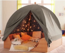 - В комплекте каркас, ткань купола, мягкий напольный мат (из 4-х частей), 4 подушки, гирлянда