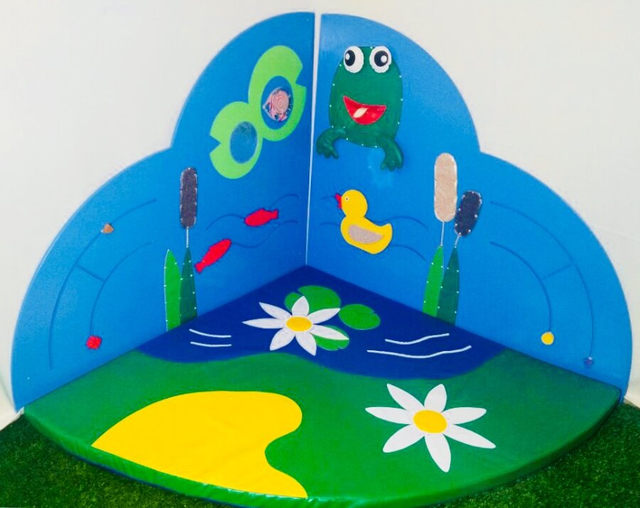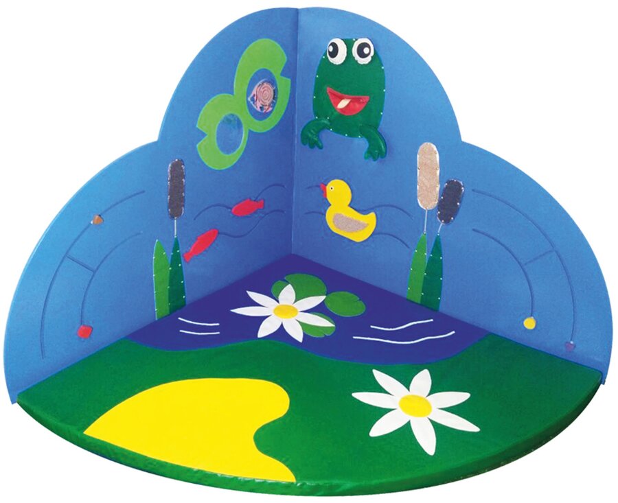 Многофункциональный модуль Сенсорный уголок Морской с яркими разноцветными элементами различных размеров и форм позволяет увлечь целую компанию детей. Уголок включает в себя 2 лабиринта, элементы, выполненные из ткани различных текстур, зеркало (травмобезопасная зеркальная поверхность). У лягушки во рту есть маленький карман для мелких предметов, а глазки лягушки подвижны.
