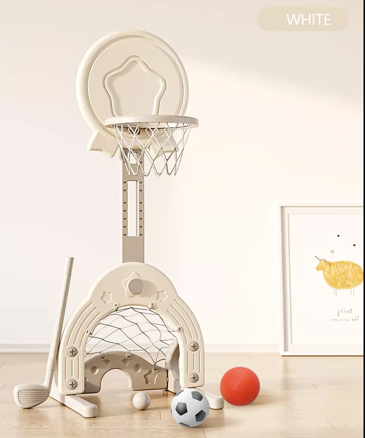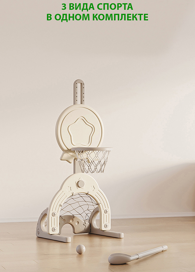 - В комплекте стойка баскетбольная, луза, ворота футбольные с ячейкой для гольфа, мяч 2 шт, мяч для гольфа, клюшка для гольфа