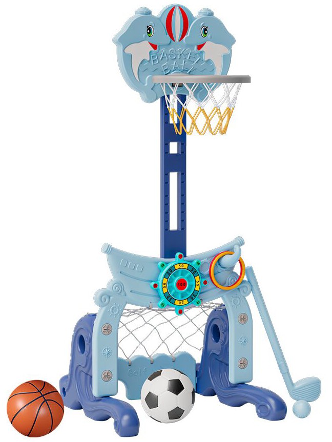 - В комплекте стойка баскетбольная, луза, ворота футбольные с ячейкой для гольфа, баскетбольный мяч, футбольный мяч, мяч для гольфа, клюшка для гольфа