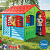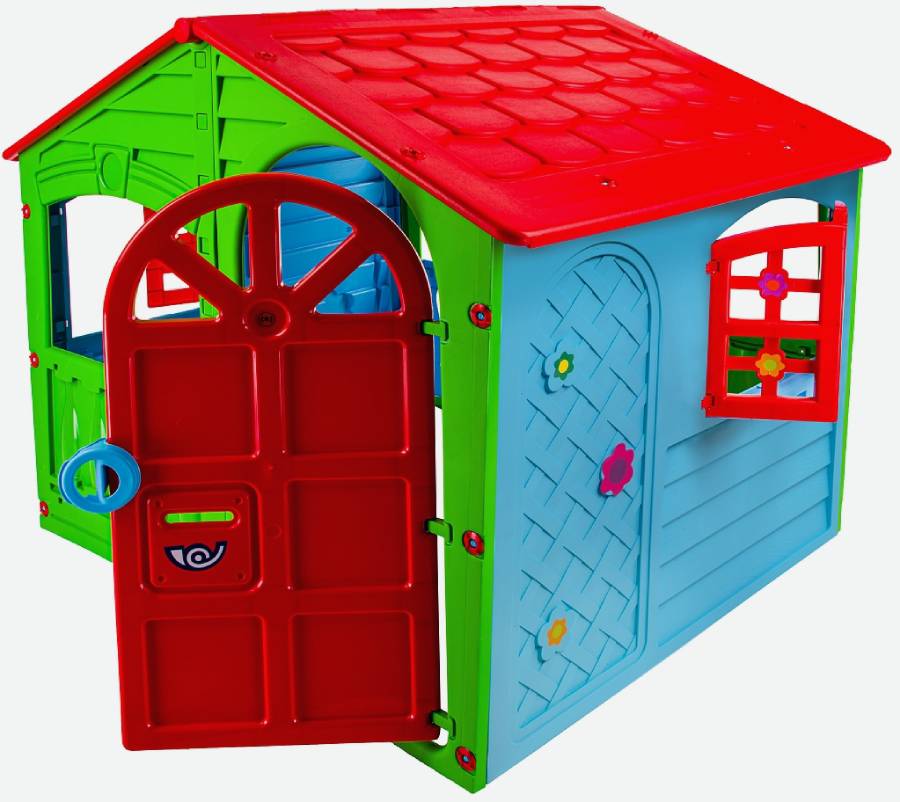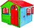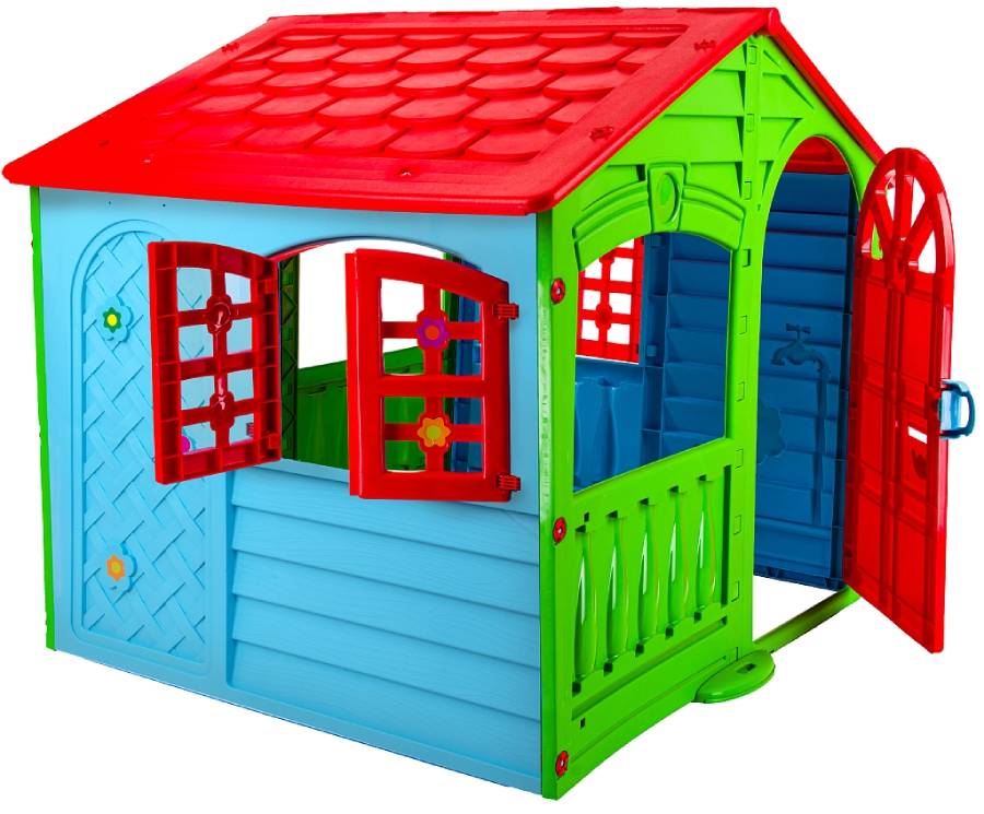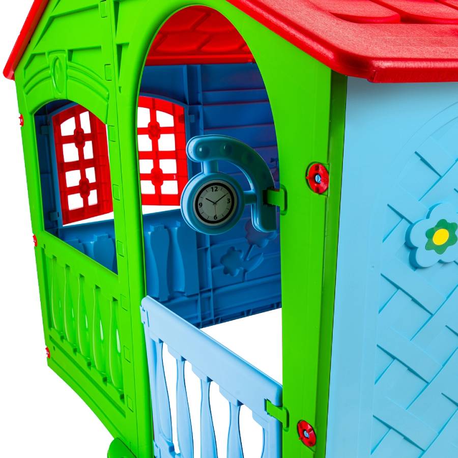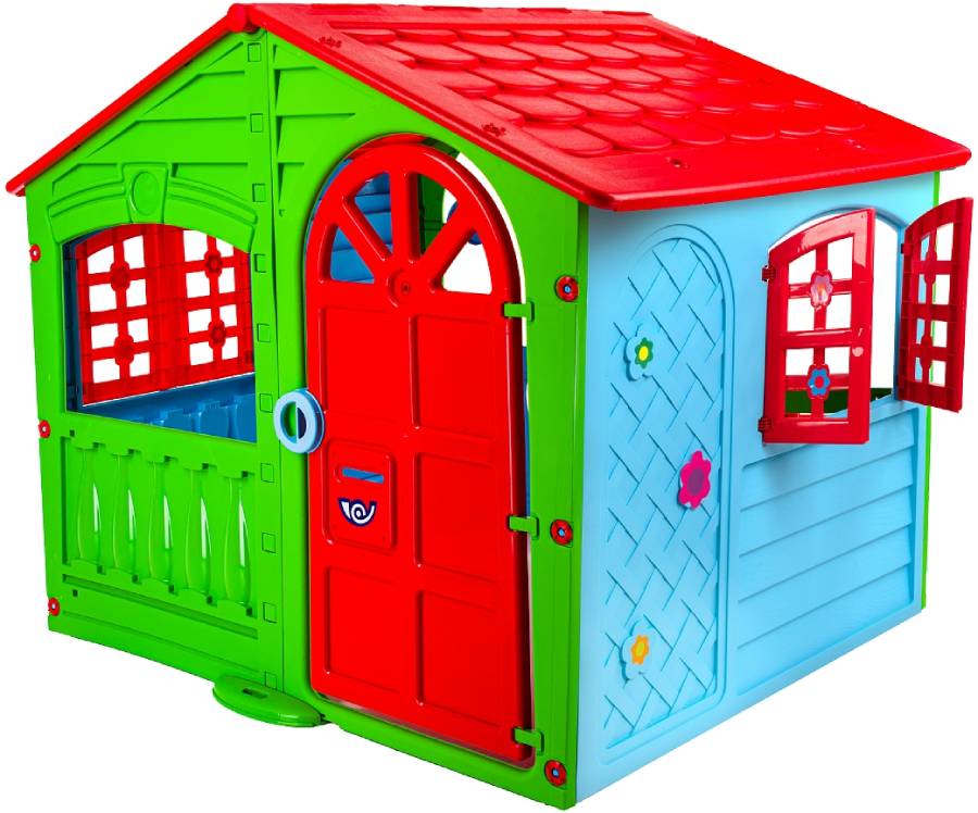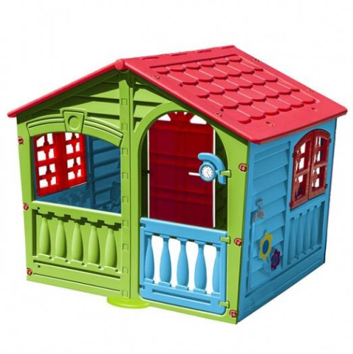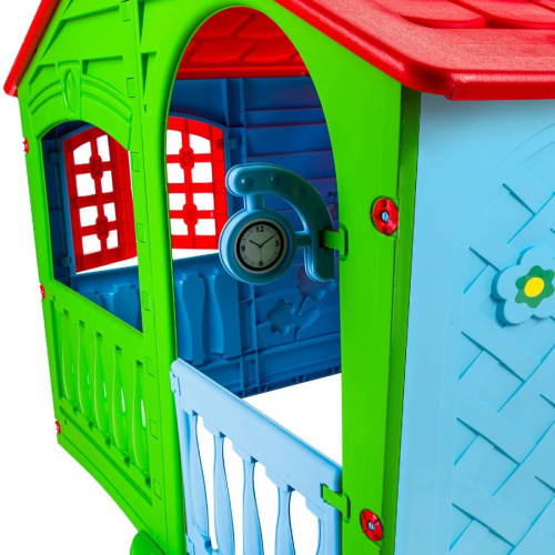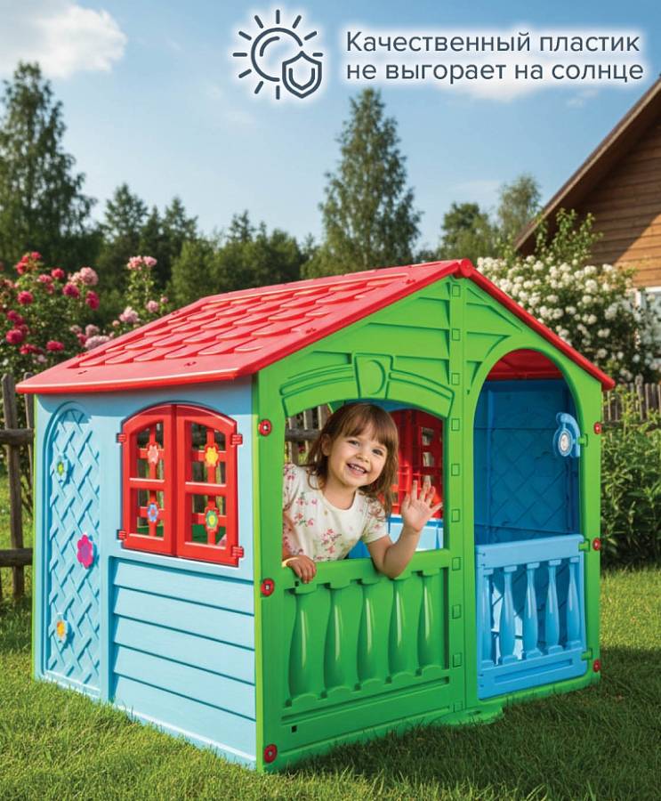 Яркий пластиковый домик выполнен в красочном дизайне, имитирующем реальный дом с фактурными стенками, распашными ставнями, арочными окошками. Домик широкий и удобный, в нем могут играть несколько детей.