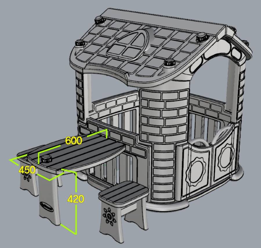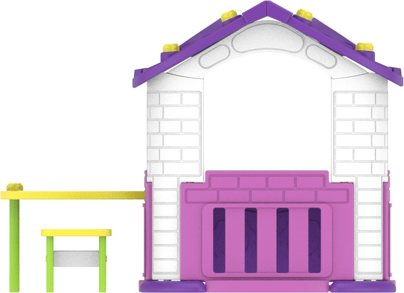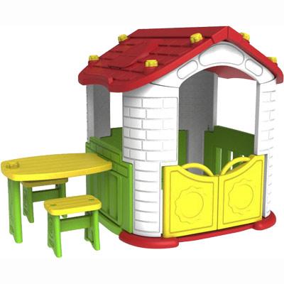Яркий Игровой домик универсальной расцветки понравится как мальчикам, так и девочкам. Данная модель дополнена столиком и двумя табуреточками.