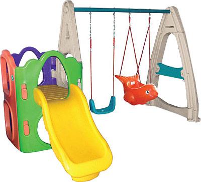 Игровой комплекс включает в себя горочку для малыша и пару качелей для детишек разного возраста.